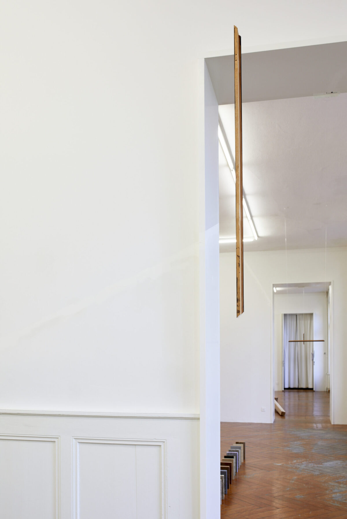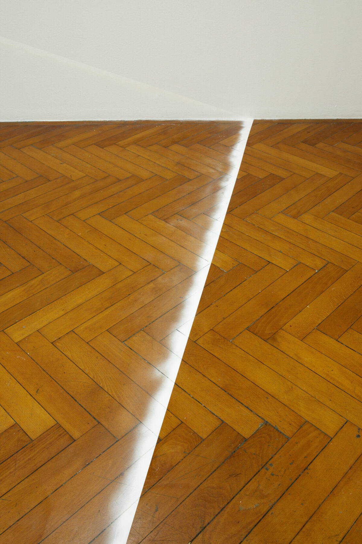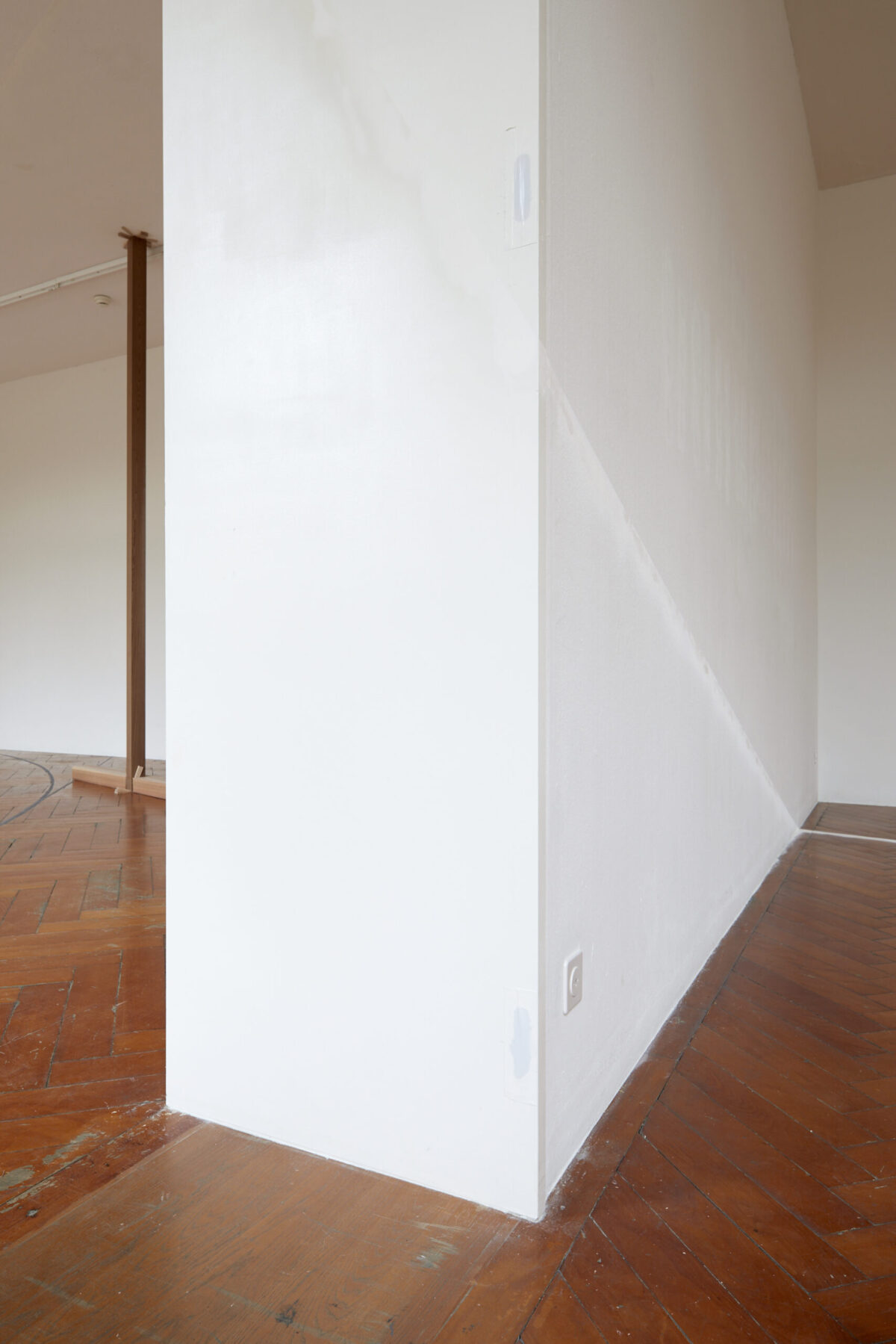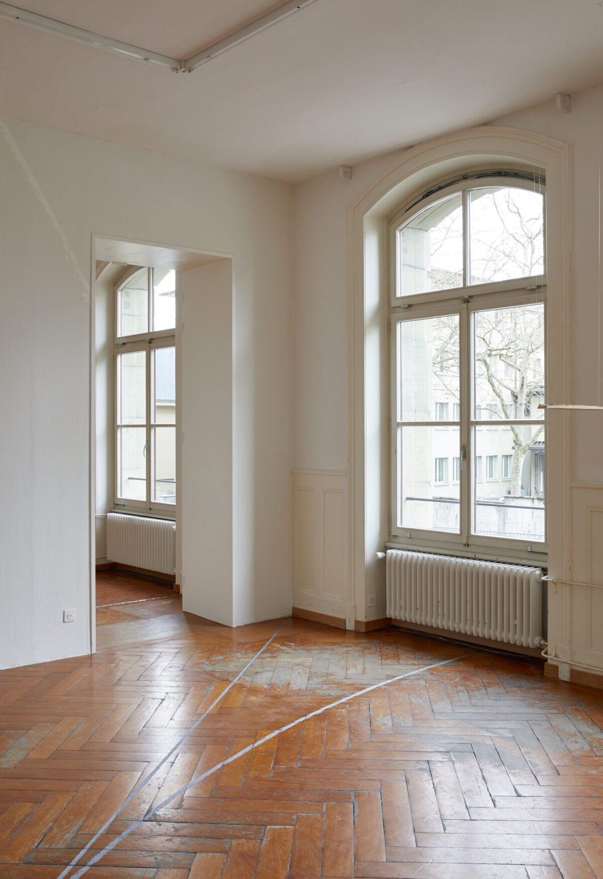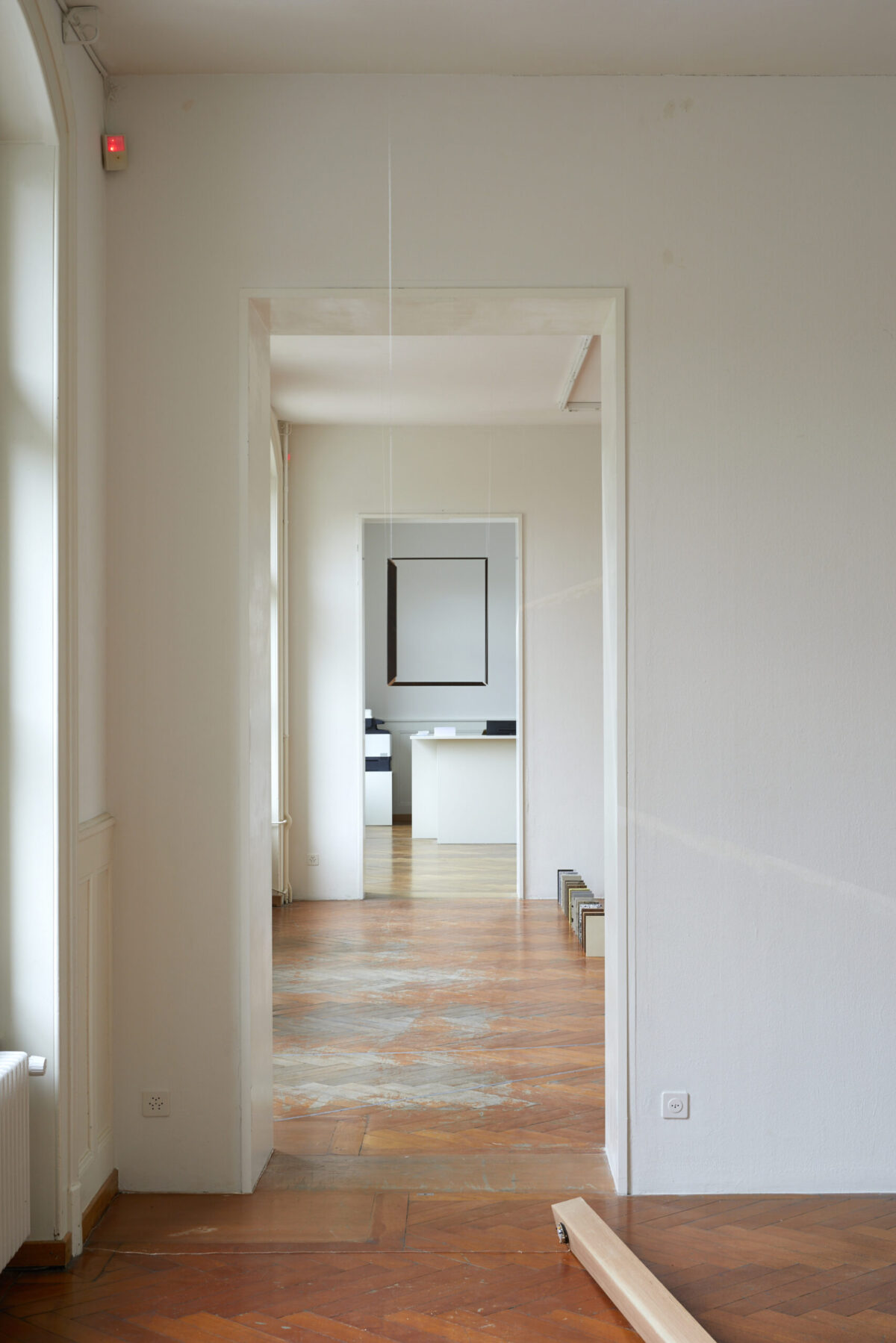 In Re-cadrement(s) hängt MAIA GUSBERTI (*1971 in Bern, lebt und arbeitet in Brüssel und Bern) die vier Seiten eines Bildrahmens so verteilt in die Räume, dass von einem bestimmten Punkt im hintersten Raum mit Blick zurück der Rahmen als Ganzes wahrgenommen werden kann. Mit der Bewegung und der Position der Betrachterin fällt der Rahmen visuell wieder auseinander und die klaren Grenzen von Bildinhalt und Rahmen lösen sich auf. Mit der Verwendung eines alten Rahmens führt die Künstlerin eine frühere Arbeit zum Thema der Rahmensetzung fort und greift die Frage der Austauschbarkeit des Bildes und dessen Grenzen wieder auf.