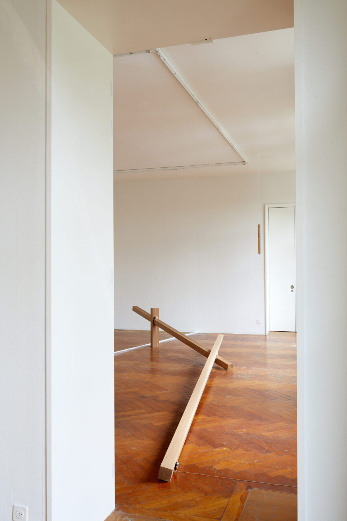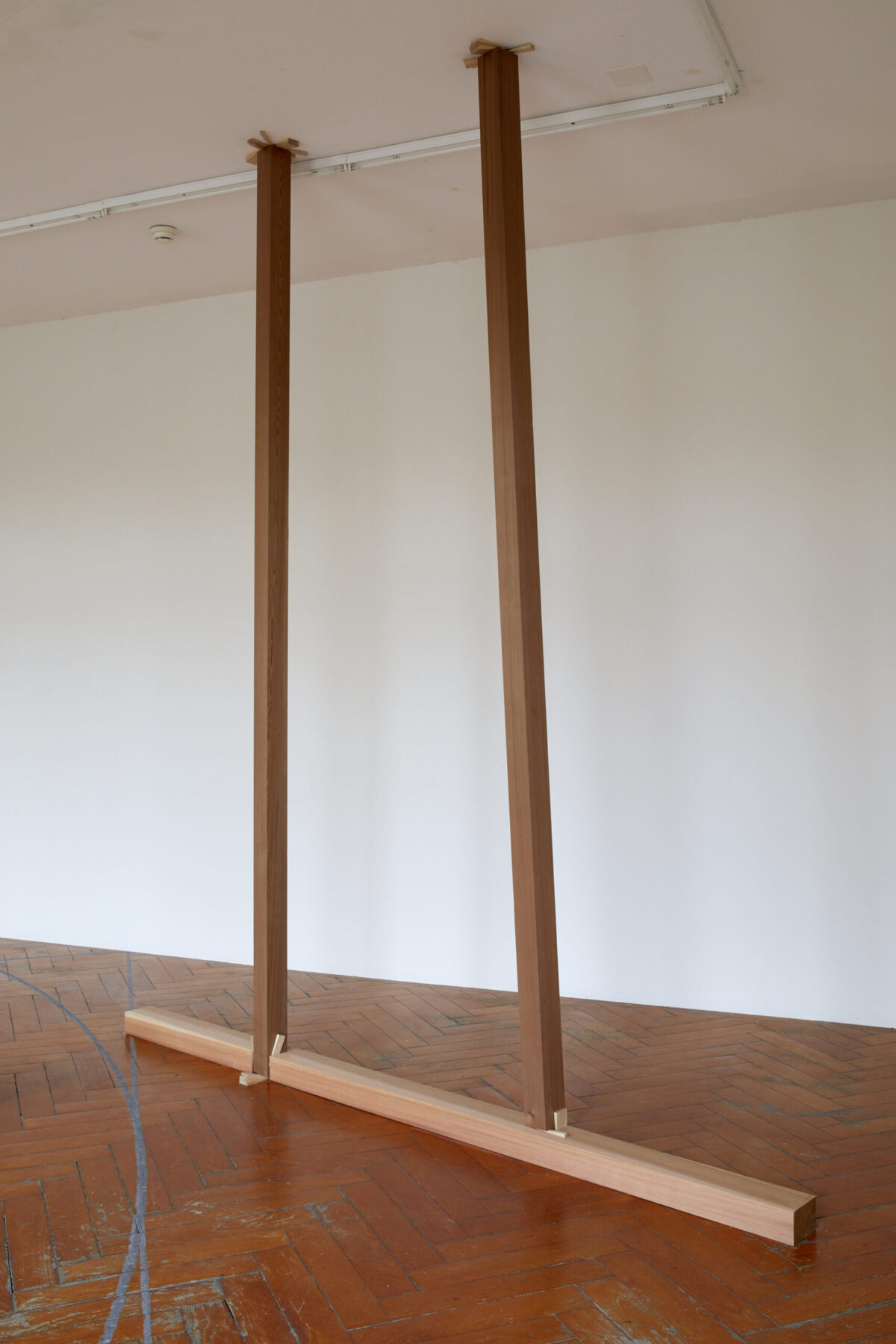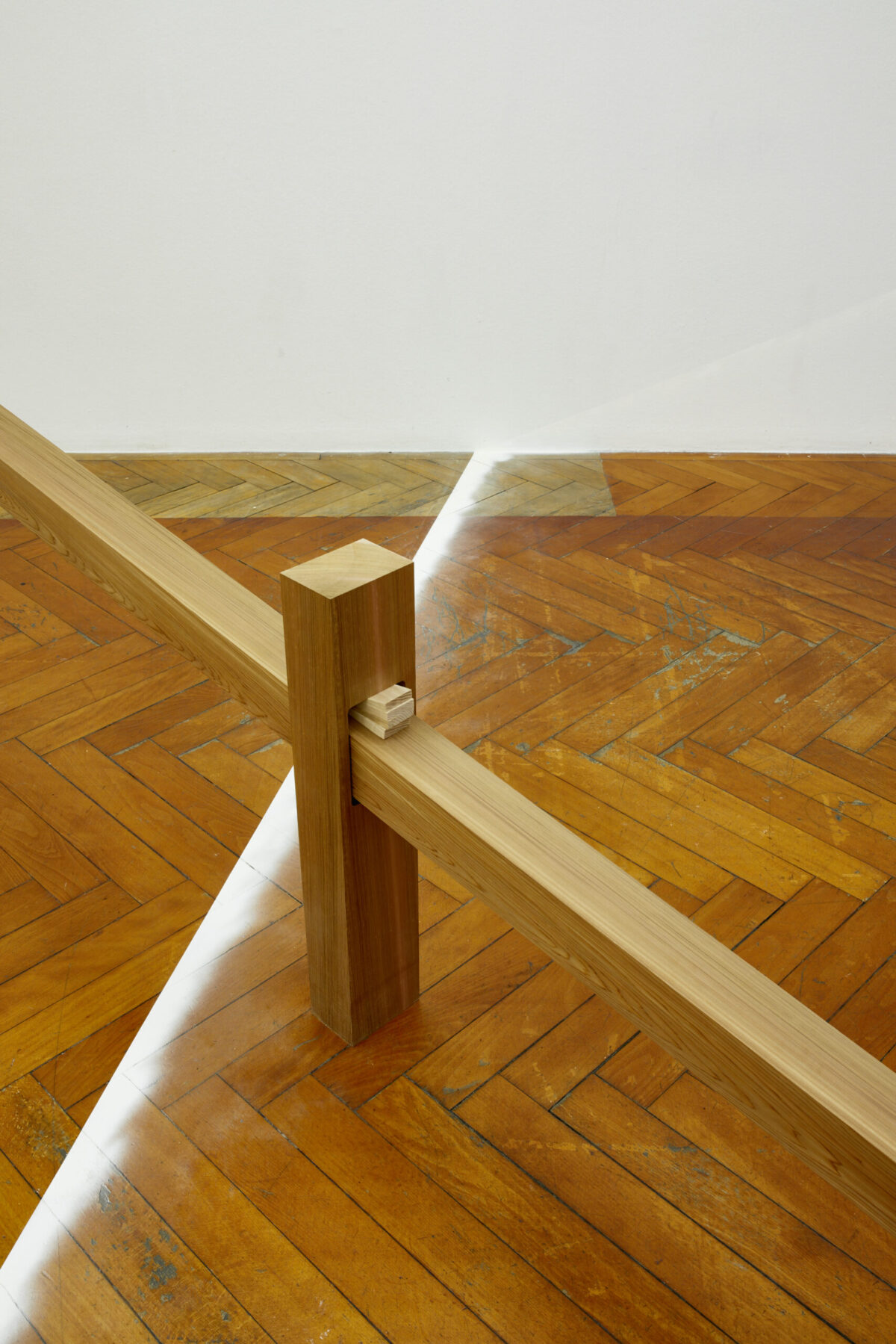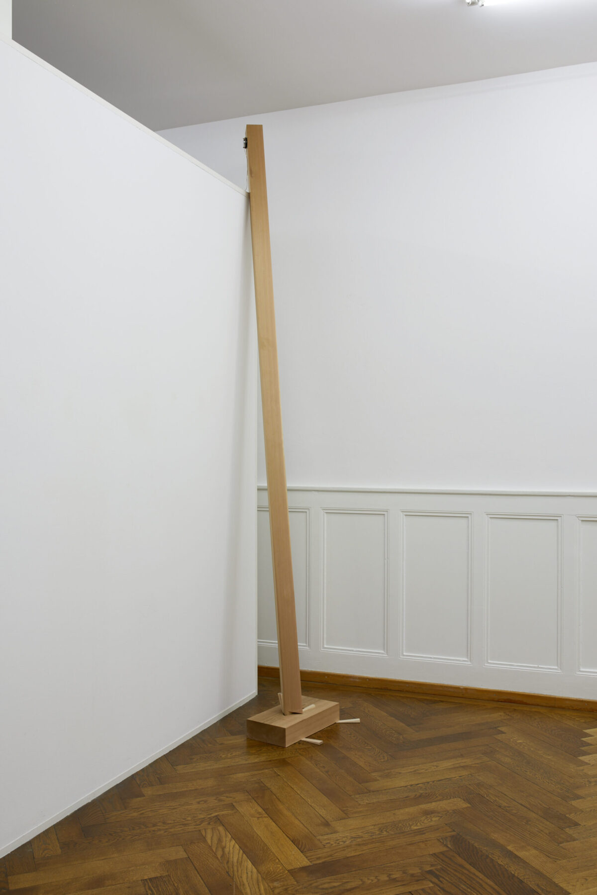 Mit den Arbeiten /, || und – – – bespielt MOHÉNA KÜHNI (*1984 in Morgins, lebt und arbeitet in Bern) die Räumlichkeiten der Stadtgalerie mit Elementen aus massivem Zedernholz. Entstanden sind die raumspezifischen Skulpturen in Zusammenarbeit mit der Schreinerin Andrea Nyffeler. Die Objekte bestehen aus mehreren modulartigen Bestandteilen, die ineinandergreifen, aufeinander aufbauen oder sich gegenseitig stützen. Der modulare Charakter der Arbeit wird durch kleine Holzkeile aufgegriffen, welche die einzelnen Teile miteinander fixieren. Diese wirken im Gegensatz zu den Balken provisorisch und unterstreichen die Idee einer agilen Skulptur, die sich auch anders zusammensetzen liesse. An Kühnis Werken angedockt befinden sich die von ANJA BRAUN (*1985 in Freiburg i. Br., lebt und arbeitet in Basel) und WENDELIN SCHMIDT-OTT (*1978 in Köln, lebt und arbeitet in Basel) platzierten Satelliten. Mit Resonatoren untersuchen sie die Klangräume der Skulpturen. Durch die musikalischen Schwingungen wird die Eigenresonanz der Objekte angeregt und somit zum Klingen gebracht. Die komponierte Klanglandschaft setzt sich aus zwei Quellen zusammen und umschliesst die Räumlichkeiten als akustischer Kreis.