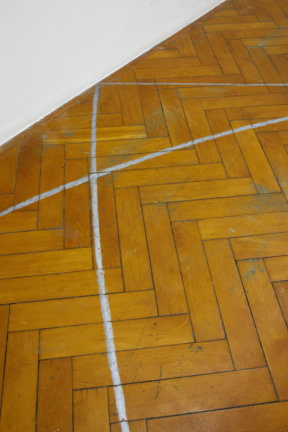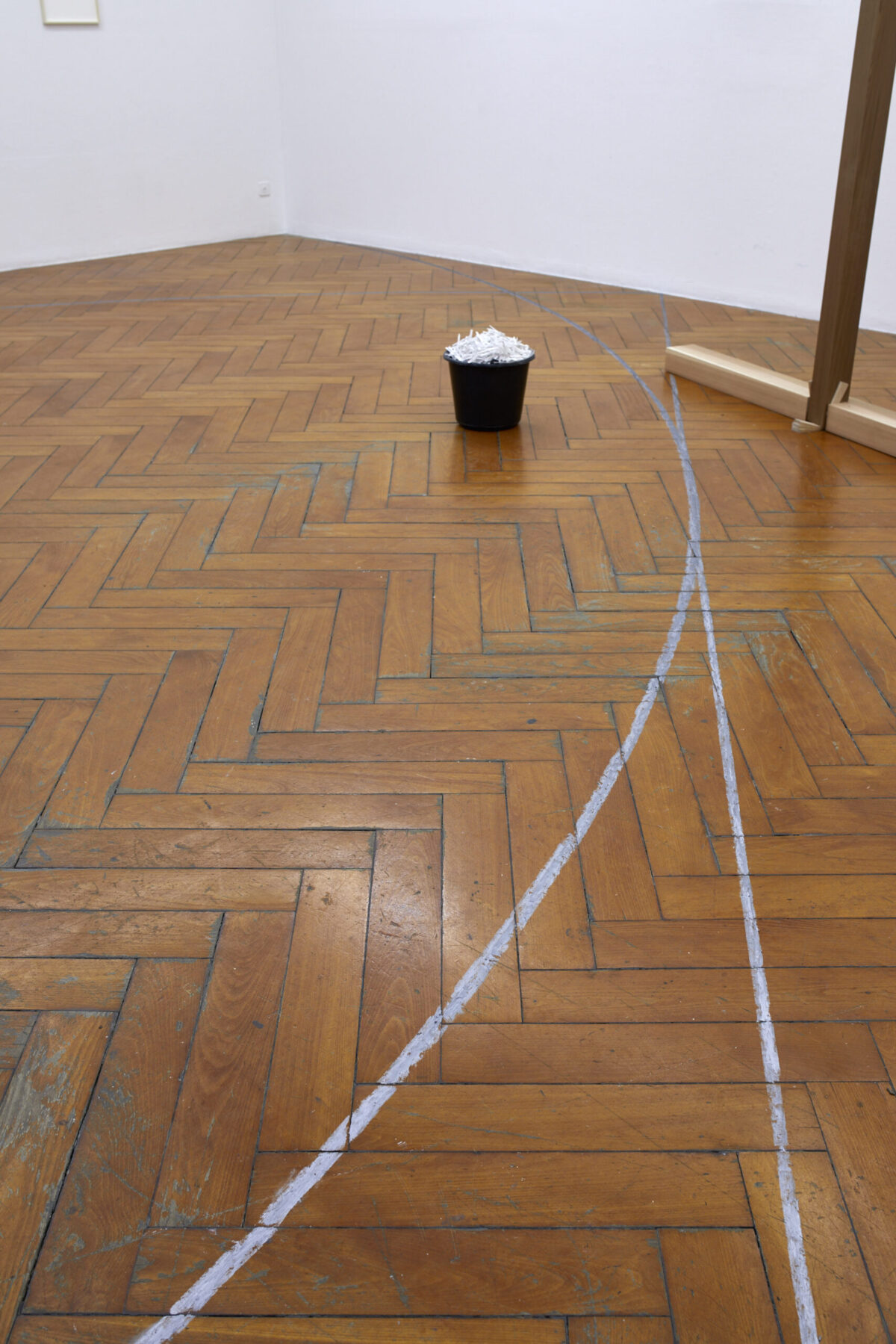 Die Arbeit Limit of Control von ANNAÏK LOU PITTELOUD (*1980 in Lausanne, lebt und arbeitet in Antwerpen und Bern) zieht sich als 37 Meter lange Linie durch die Ausstellung. Das weisse Kreideband teilt sich durchgehend in zwei Seiten: in ein klare, präzise und ein ungenaue, offen auslaufende. Als duales Zeichen verkörpert es sowohl Kontrolle und Entscheidung als auch Zufälligkeit.