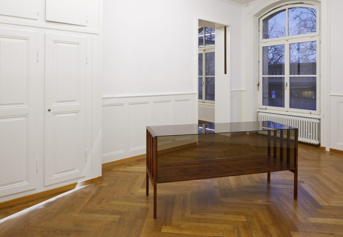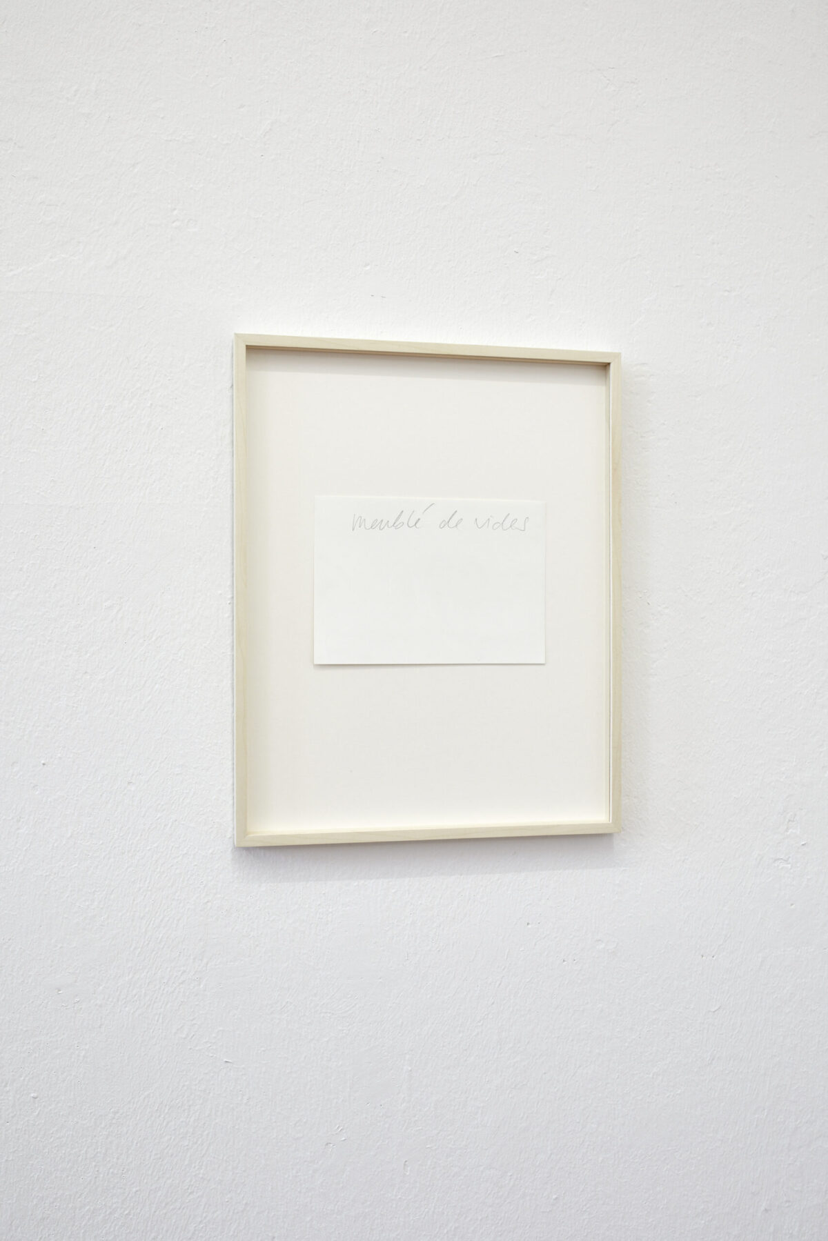 Mosers Arbeit My word against yours manifestiert sich als zusätzlich im Saalplan eingezeichnete Wand, die im realen Ausstellungsraum jedoch nicht zu finden ist. Die Künstlerin erweitert den Ausstellungsraum durch die Ebene der Vorstellung und widerspricht der scheinbaren Gültigkeit eines Saalplans. Als im Raum präsentes, jedoch verschlossenes Objekt, erinnert die Arbeit Möbel von REBECCA (*1986 in Bern, lebt und arbeitet in Bern) in ihrer Form an ein Bett. Mit dem Titel unterstreicht die Künstlerin die potentielle Funktion des Objekts, die es durch seine Verglasung jedoch verweigert. Als Verweis auf den Zustand der Schlaflosigkeit gelesen, bedeutet das Objekt eine Art Gedankenraum, in dem die Imagination passiert, jedoch (noch) nicht in die Realität entweichen kann. Den Text meublé de vides präsentiert MIRIAM STURZENEGGER (*1983 in Zürich, lebt in Bern, arbeitet in Emmenbrücke) als gerahmte Zeichnung. Die Worte rufen nach einem gemeinten Raum, der in der Vorstellung existiert. Mit der Formulierung eines Raums, in dem die Leere zur physischen Grösse wird, scheint die Arbeit sich selbst zu kommentieren.