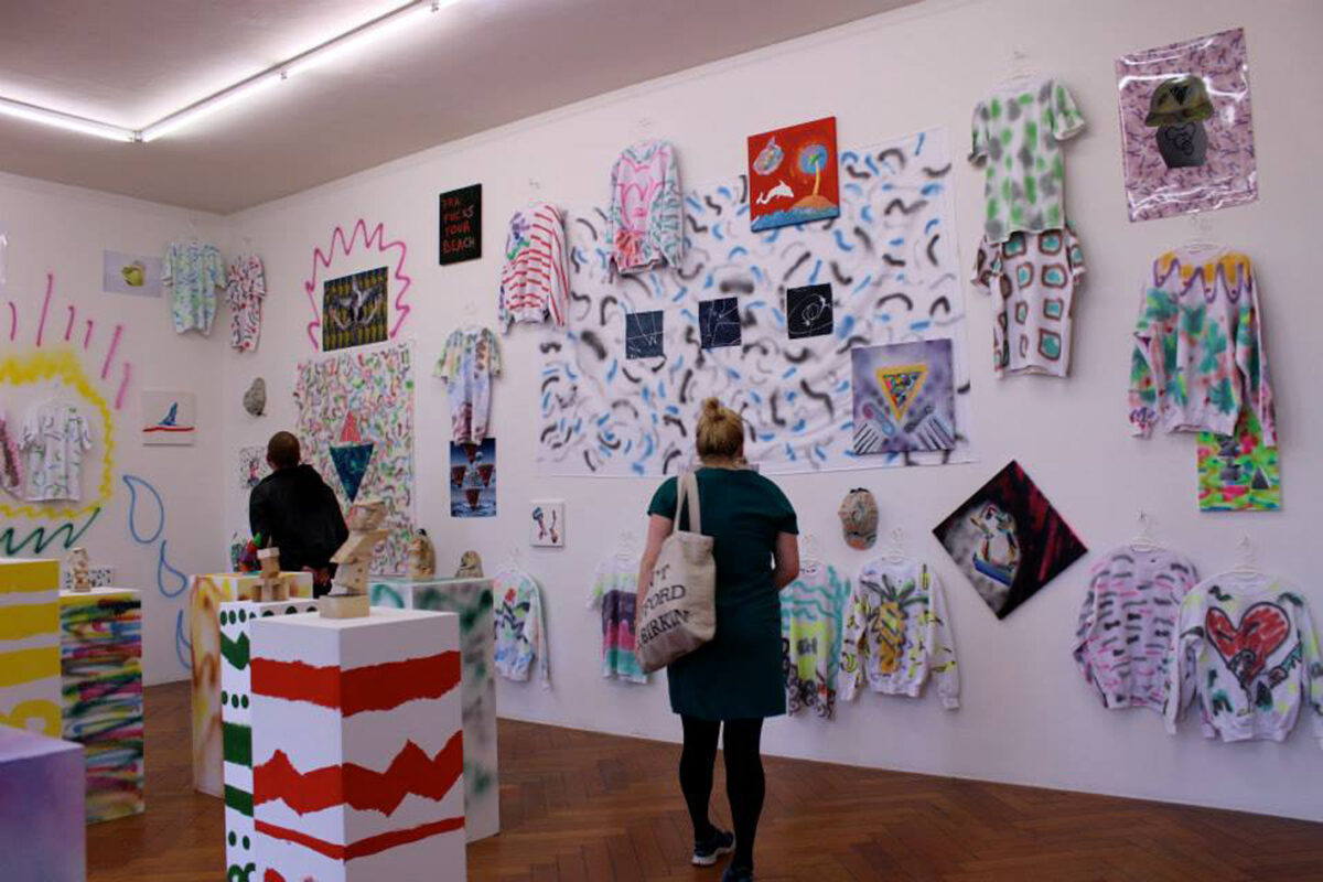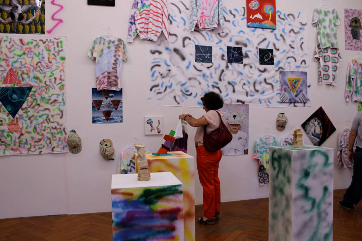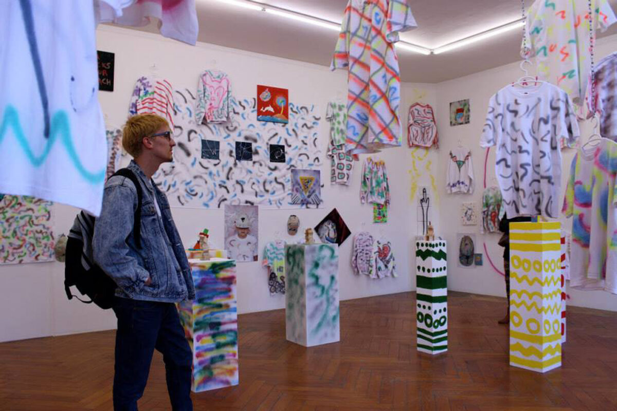 Auch bei Francisca Silva’s Installation finden sich Betrachtende im Werk wieder. Die Einzelteile stehen zwar auch in einem Gesamtzusammenhang, beanspruchen jedoch für sich einen Eigenwert, unabhängig vom Ganzen. Die Kleidungsstücke können gekauft und mitgenommen werden, so werden sie zu Souvenirs; wie in einem Museumsshop. Der Künstlerin geht es aber damit um das Eindringen ihrer Kunst in den Alltag anderer Leute. Das Publikum soll als Multiplikator ihre Motive in die Welt hinaus tragen. Francisca Silva erachtet es als wichtig, Maluntergründe zu finden, mit denen sie Kunst und Alltag verknüpfen kann. Kleider oder auch menschliche Haut behandelt die Künstlerin wie jeden anderen Träger von Malerei. Sie macht ihren Namen, «Fra», zu einem Brand, der als ironischer Kommentar zu einer Jugendkultur steht, der sich sich zugehörig fühlt und die sie zelebriert. Zu dieser, wie sie selbst sagt, «stehengebliebenen Jugendkultur» gehören Kollaborationen mit anderen. In Fotosessions entstehen das Gemüse Shooting mit Cruncky Nuttz oder die Cappys & Tücher im Pizza Collettivo. Begleitet wird diese selbstgeschöpfte Kultur von einer bestimmten Rhetorik, die sich auch in Sprachbildern ausdrückt. Die Sprache hat bei Francisca Silva einen hohen Stellenwert, es entstehen RAPs, die wie die anderen Motive als gleichwertige Zeichen auf dem Maluntergrund erscheinen.
