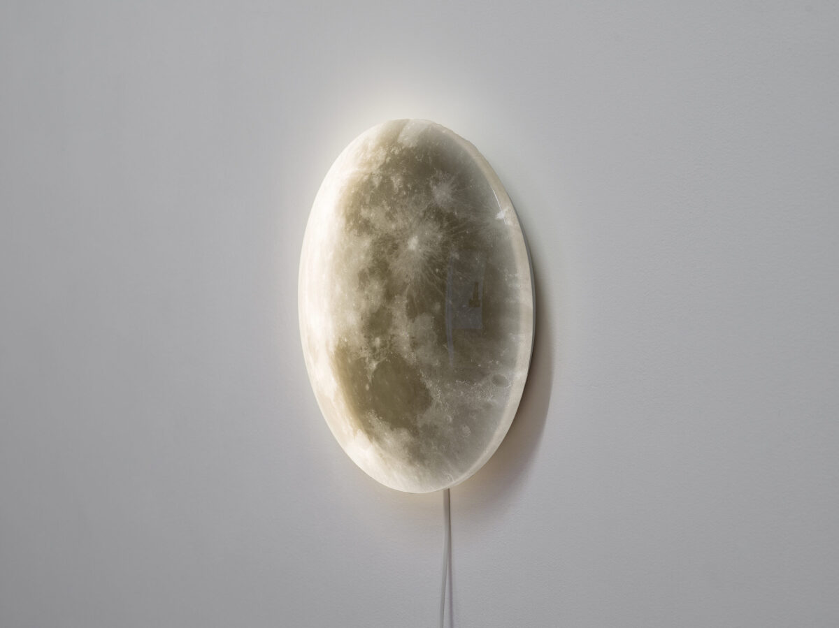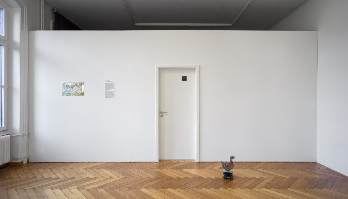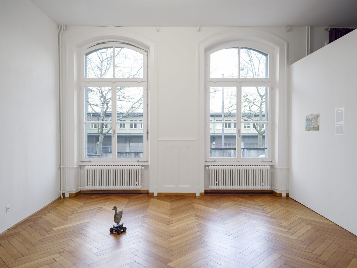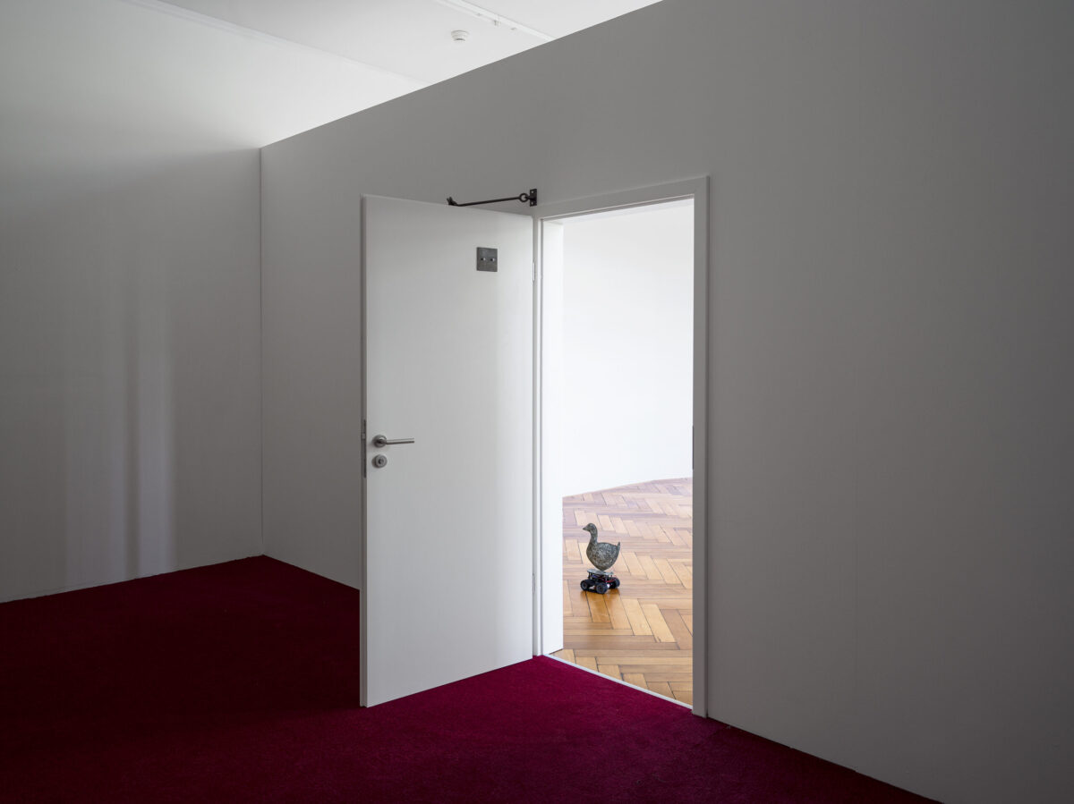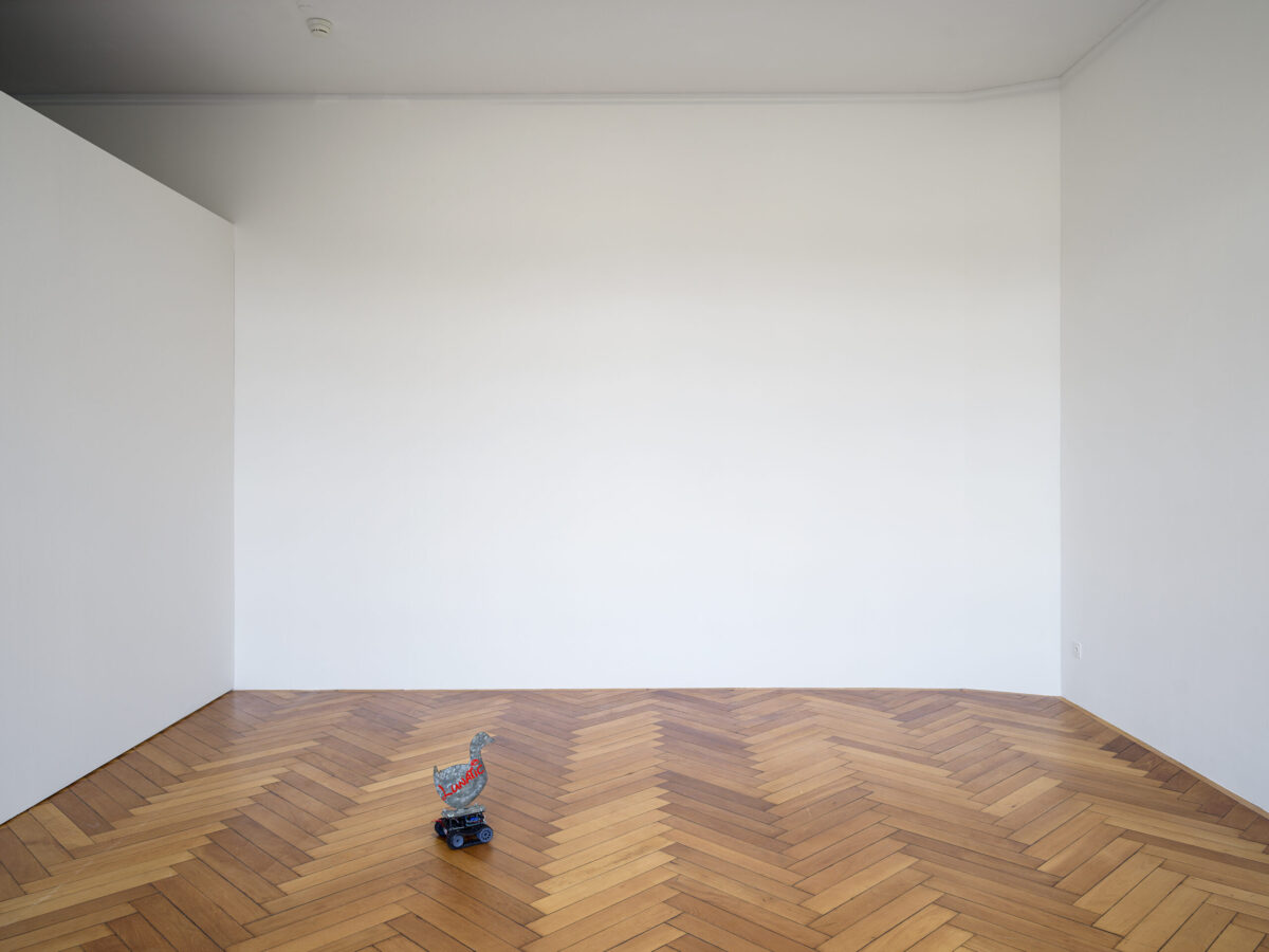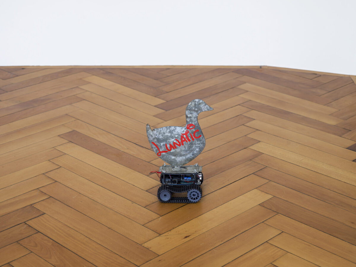 MIRIAM LAURA LEONARDI’s Lunatic Duck (2021) besteht aus einer antiken, in Blech getriebenen Ente, die auf einem Roboter montiert ist. Sie wird von den gleichen Lithiumbatterien angetrieben, welche von Tesla für Elektroautos verwendet werden. Die antike Ente ist markiert mit dem Wort «Lunatic», in der Disney-Schrift.