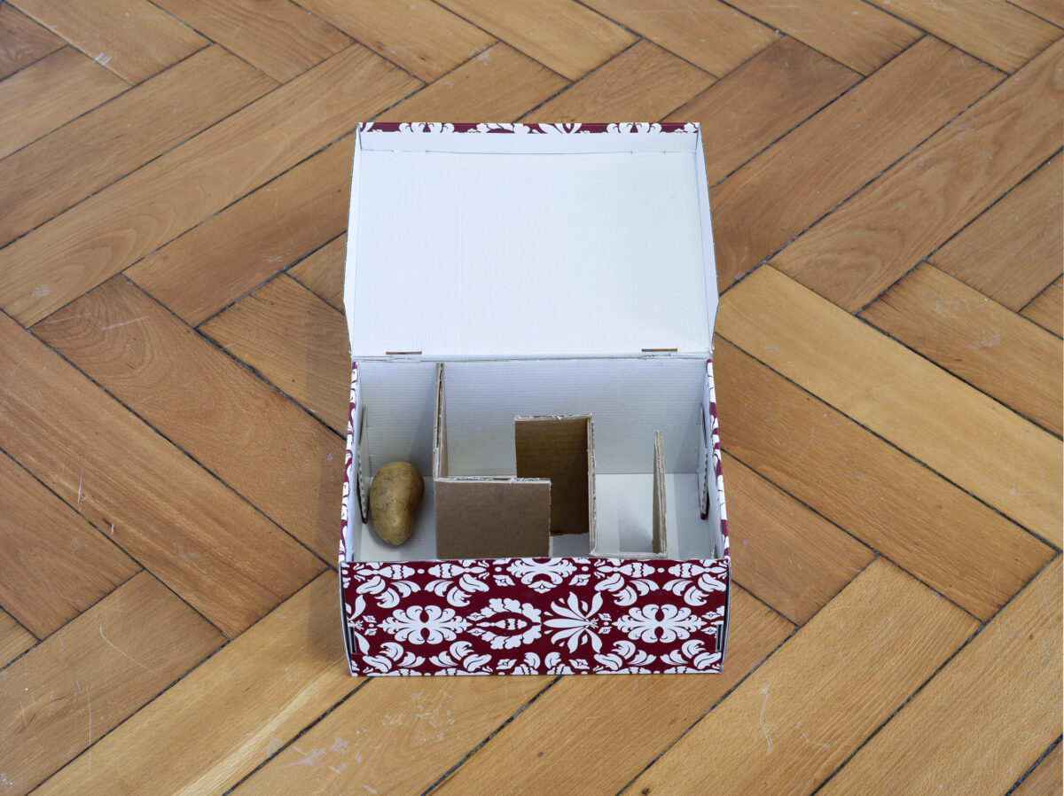 Das Kartoffellabyrinth [POTATO MAZE] ist eine Versuchsanordnung zur Veranschaulichung des Wachstumsverhaltens von Pflanzen: Eine einfache Kiste wird zum Hindernisparcour für eine Kartoffel. Mit der Zeit schlängeln sich die Keime der Pflanze auf der Suche nach Sonnenlicht durch das Labyrinth.