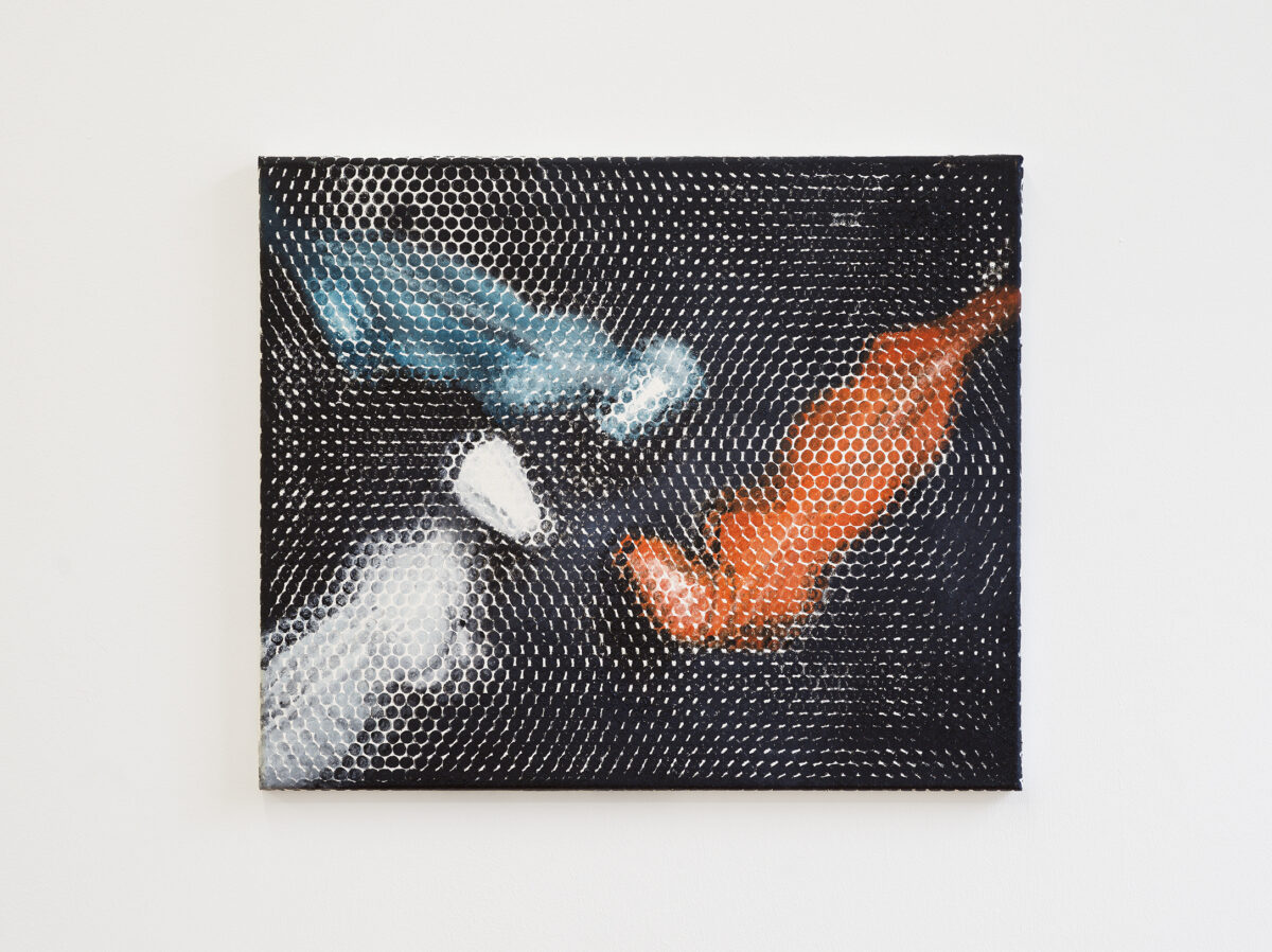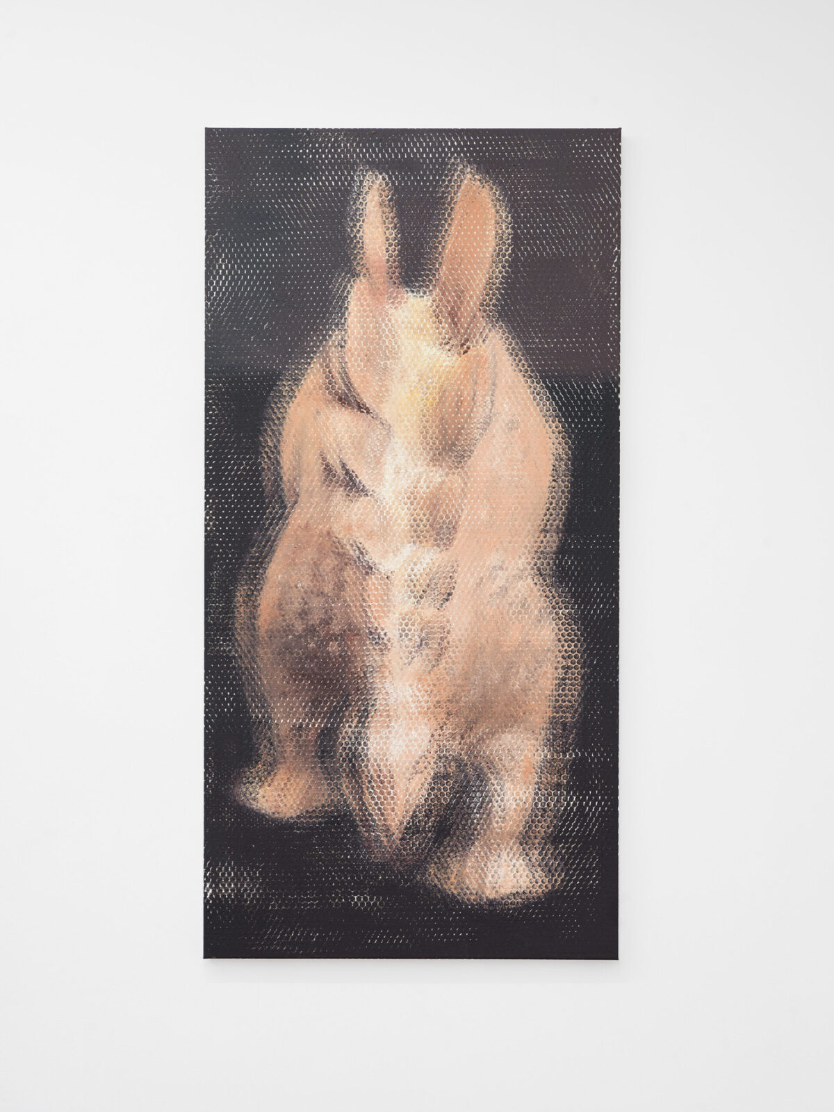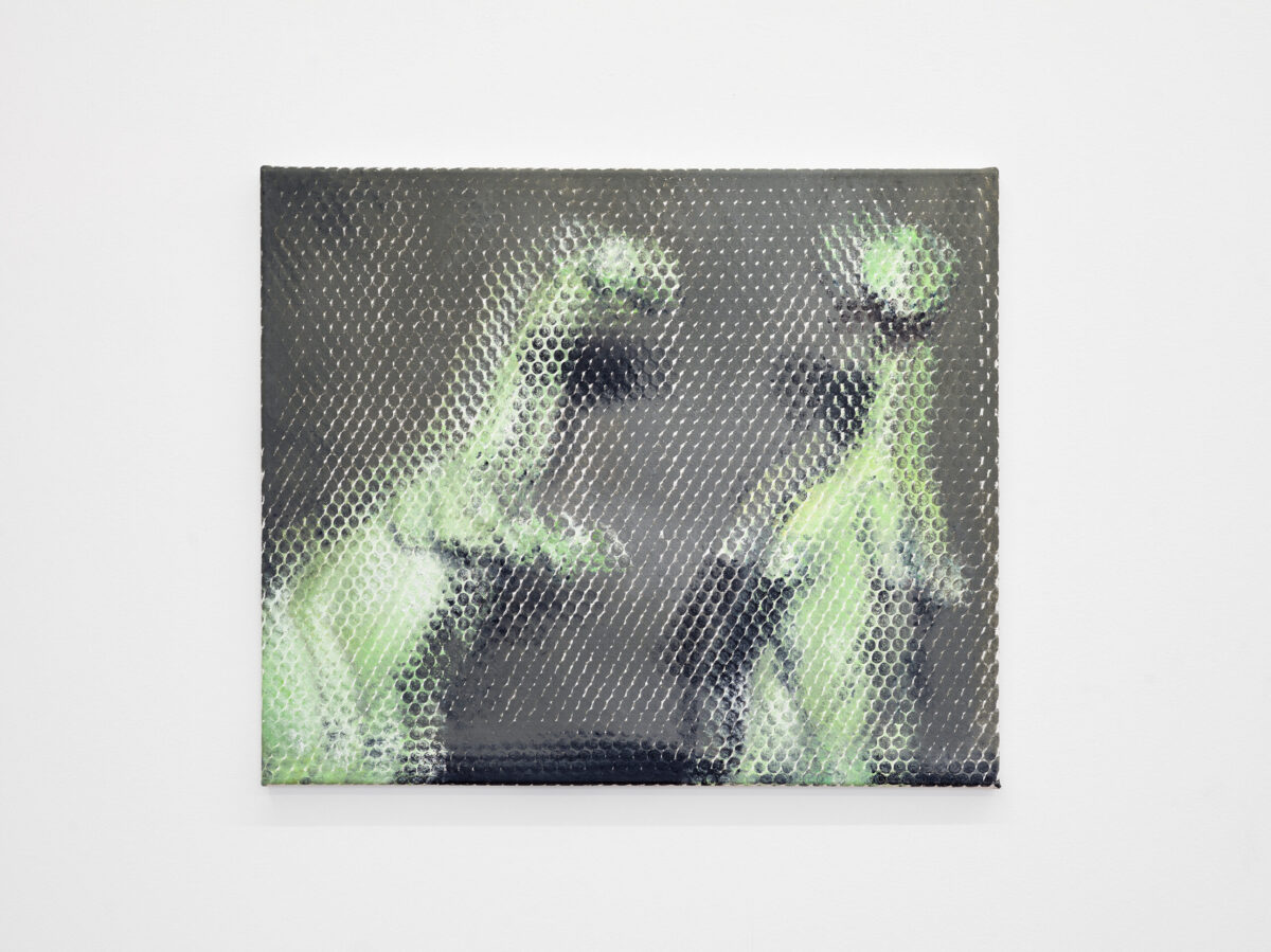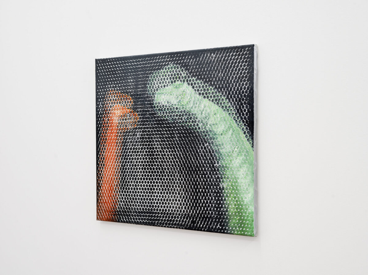 MICHAEL VAN DEN ABEELE denkt sehr oft über Dinosaurier nach. Seit 2014 malt er sie, und 2017 begann er damit, sie (basierend auf Nahaufnahmen von Spielzeug) hauptsächlich auf Luftpolsterfolie zu malen, bevor er sie zwei- oder dreimal auf die Leinwand überträgt. Die gemalten Dinosaurier werden während dieses Prozesses überführt – jedoch nur die Stellen, die auf der Oberseite der Plastikblasen liegen. Durch Abstraktion entsteht das Bild der Kreaturen als Moiré. Dabei wird auf die Tradition der Op Art angespielt und eine rudimentäre Form des Druckens erfunden.