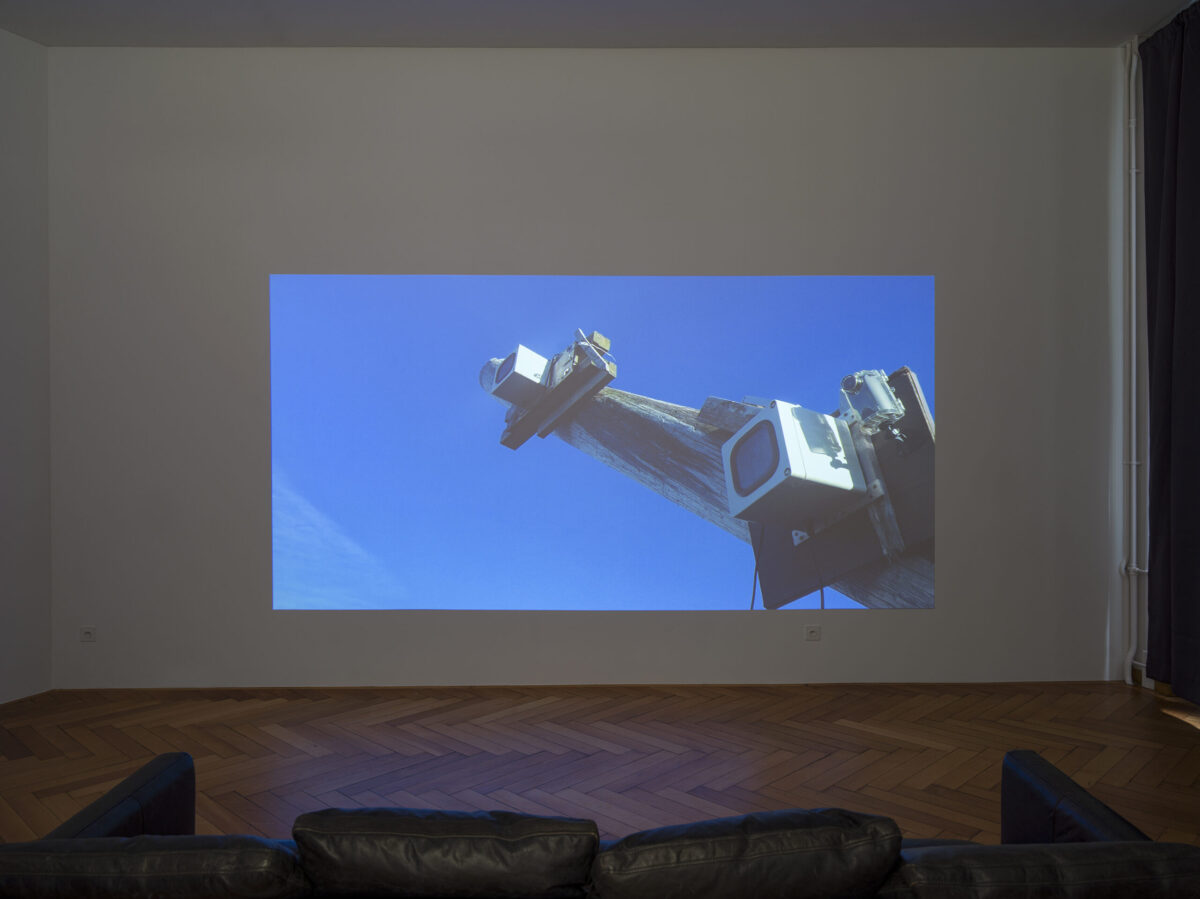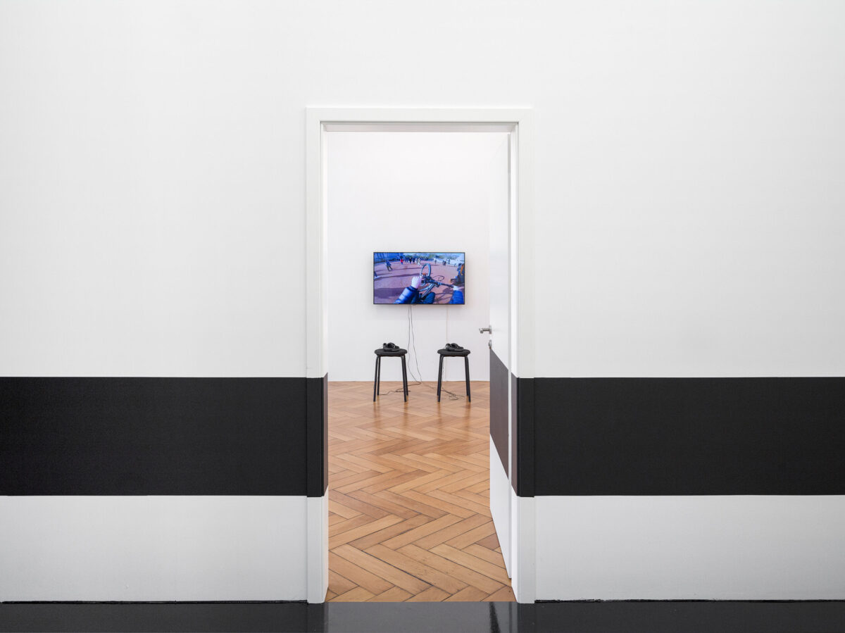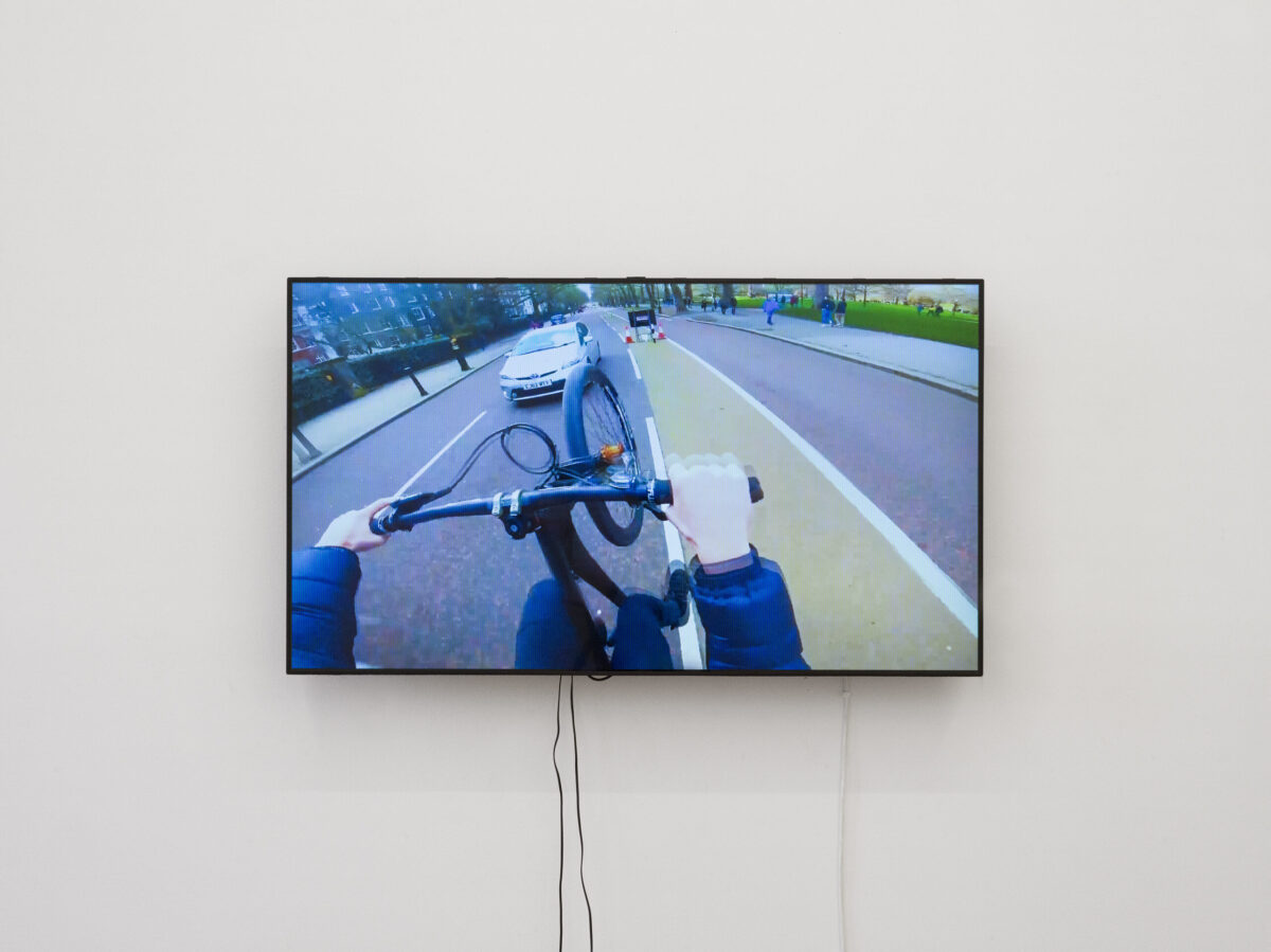 In den 1970er-Jahren entwickelte die Künstlerin Margaret Raspé einen Helm, der es ihr ermöglichte, eine Kamera am Kopf zu befestigen und während verschiedener häuslicher Aktivitäten aus ihre Perspektive zu filmen. In ähnlicher Weise – aber aus einer anderen häuslichen Situation heraus, nämlich der des Lockdowns in London (während Covid-19) – produzierte RUTH ANGEL EDWARDS das Video Trip in Me (2020) als Reflexion über städtische Fehlfunktionen und tägliche Routine. Unterlegt mit ihrem eigenen DJ-Mix aus Drum & Bass, Mashups und mechanischen Klängen. Das Video, gänzlich als Point-of-View-Shot gedreht, setzt mit einer morgendlichen Routine ein: Duschen, dann frühstücken auf dem Dach ihres Hauses, und ein Outfit wählen, bevor sie sich nach draussen wagt, wo sie als Teil einer Fahrrad-Gang mit Wheelies durch die Strassen von Central London zieht. Ein Remix von J-Los Waiting for Tonight untermalt die Aktivitäten, während langsam klar wird, dass es sich um Found Footage handelt, das geschickt zusammengeschnitten wurde (die Künstlerin trägt den gleichen schwarzen Mantel wie der waghalsige Protagonist). «Don’t liberate me, I’ll take care of that.» [«Befreie mich nicht, ich kümmere mich darum»]