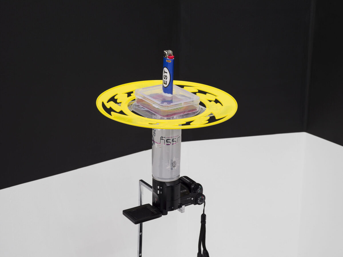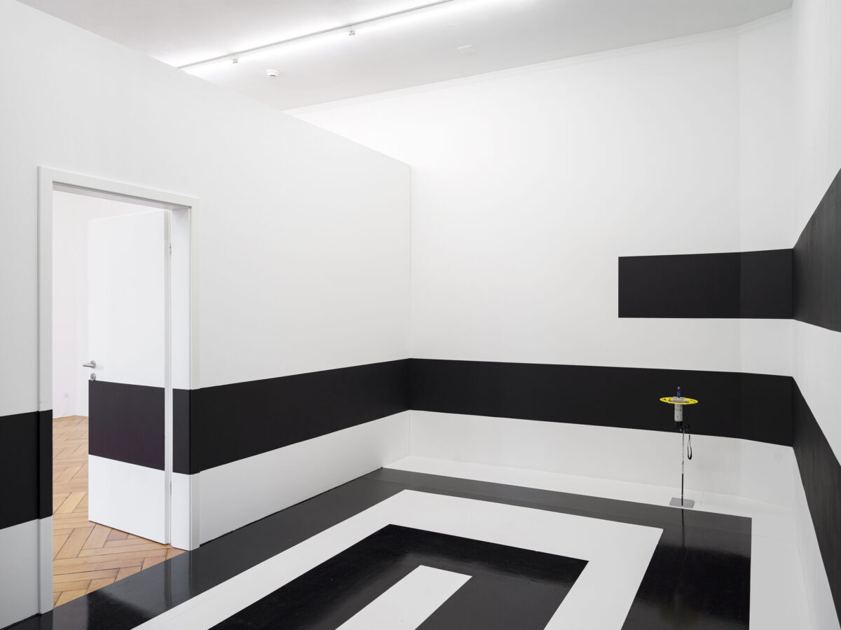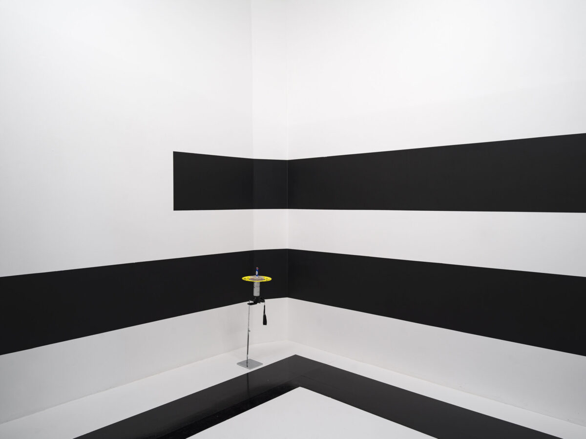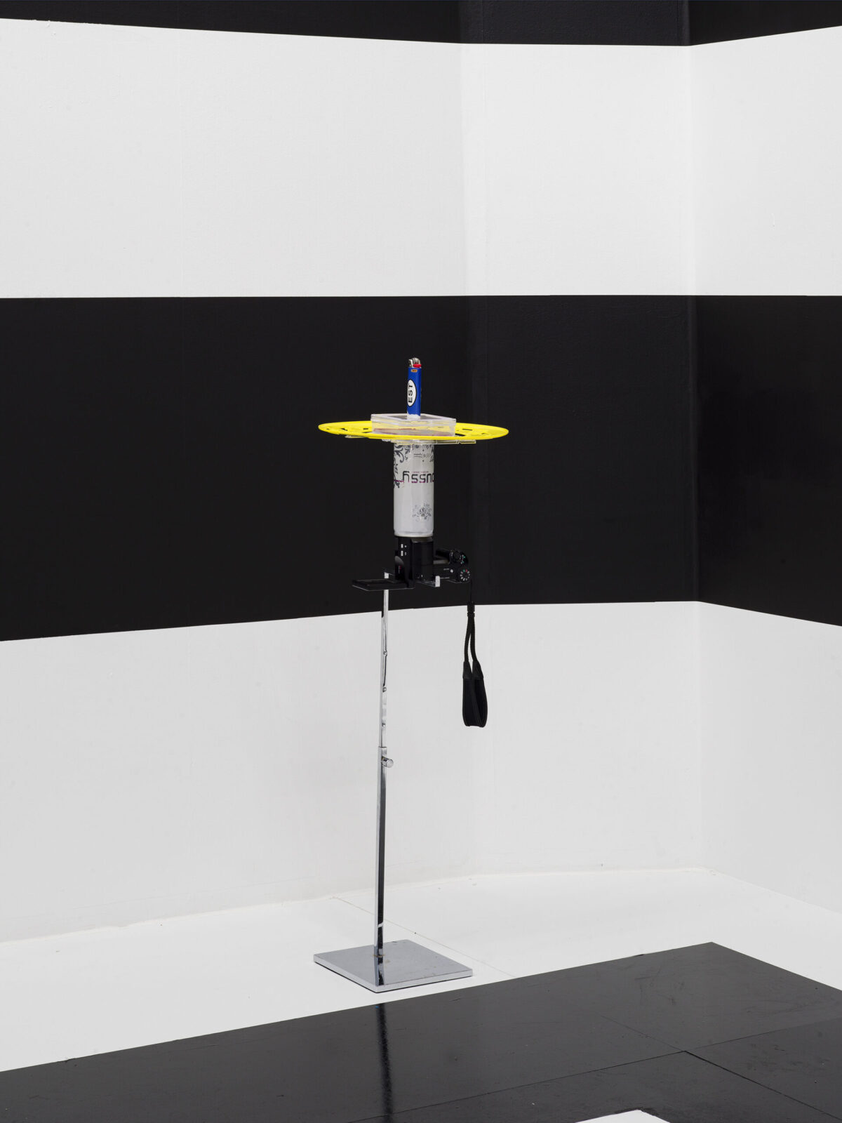 GRETCHEN LAWRENCEs Spirale, My Spiral (2022), füllt den Raum mit ihrer Geometrie. Die Wände und der Boden werden als Flächen genutzt, auf die schwarze Farbe aufgetragen wird, um eine gross angelegte Rauminstallation zu schaffen. Ihre Spirale füllt den Fussboden aus und wird an den Wänden weitergeführt. Zwei Räume entstehen auf den Oberflächen: der schwarze Raum und der weisse Raum. Dies könnte als positiver und negativer Raum verstanden werden oder als das, was ist und was nicht ist, beides sich windend und somit gleichzeitig existierend. Innerhalb der Installation befindet sich ausserdem eine Skulptur, die aus persönlichen Gebrauchsgegenständen oder gefundenen Objekten assembliert wurde, die lose mit gelebter Erfahrung in Verbindung stehen. Hier ist der Energydrink mit dem derben Namen «Pussy» auf eine Jewel-CD-Hülle und eine Digitalkamera geklebt. Was dabei in Erinnerung gerufen werden könnte, ist der erfinderische Teenage-Hedonismus, als das Kaufen von Alkohol nicht möglich war und das Trinken von zu viel Koffein das damalige High darstellte. Konsumpsychologie und Entwicklungspsychologie können manchmal miteinander verknüpft werden, wenn man an Teenager denkt.