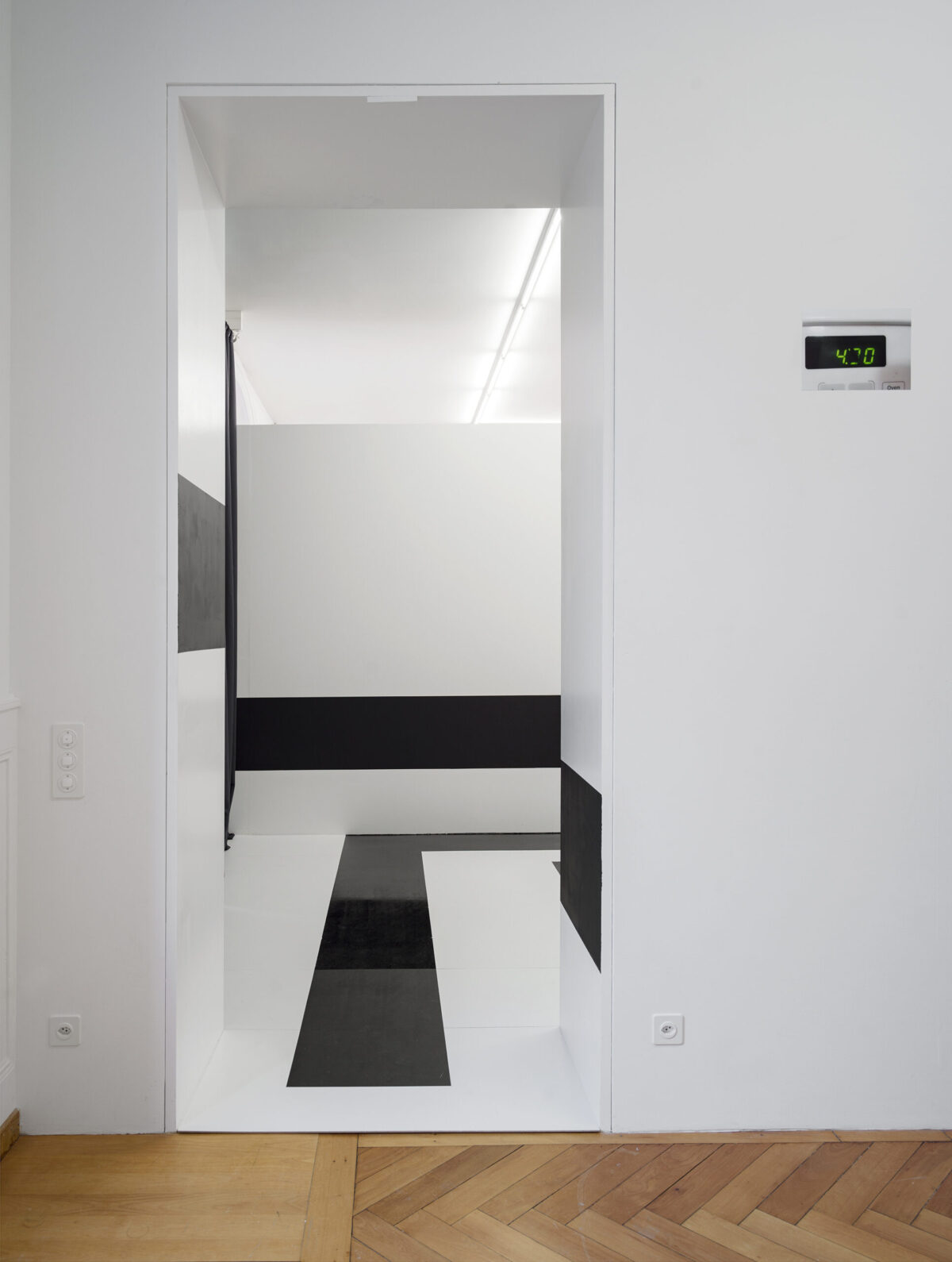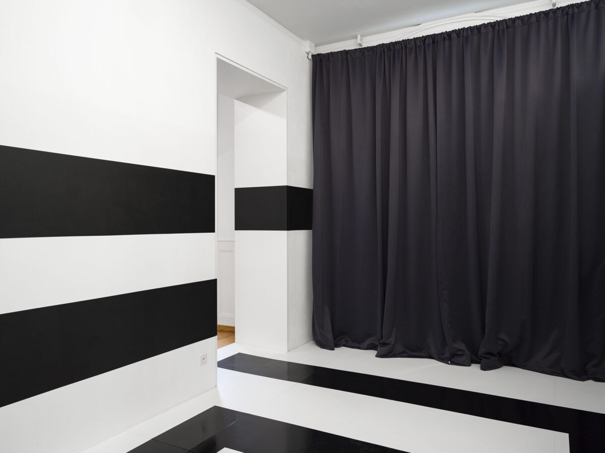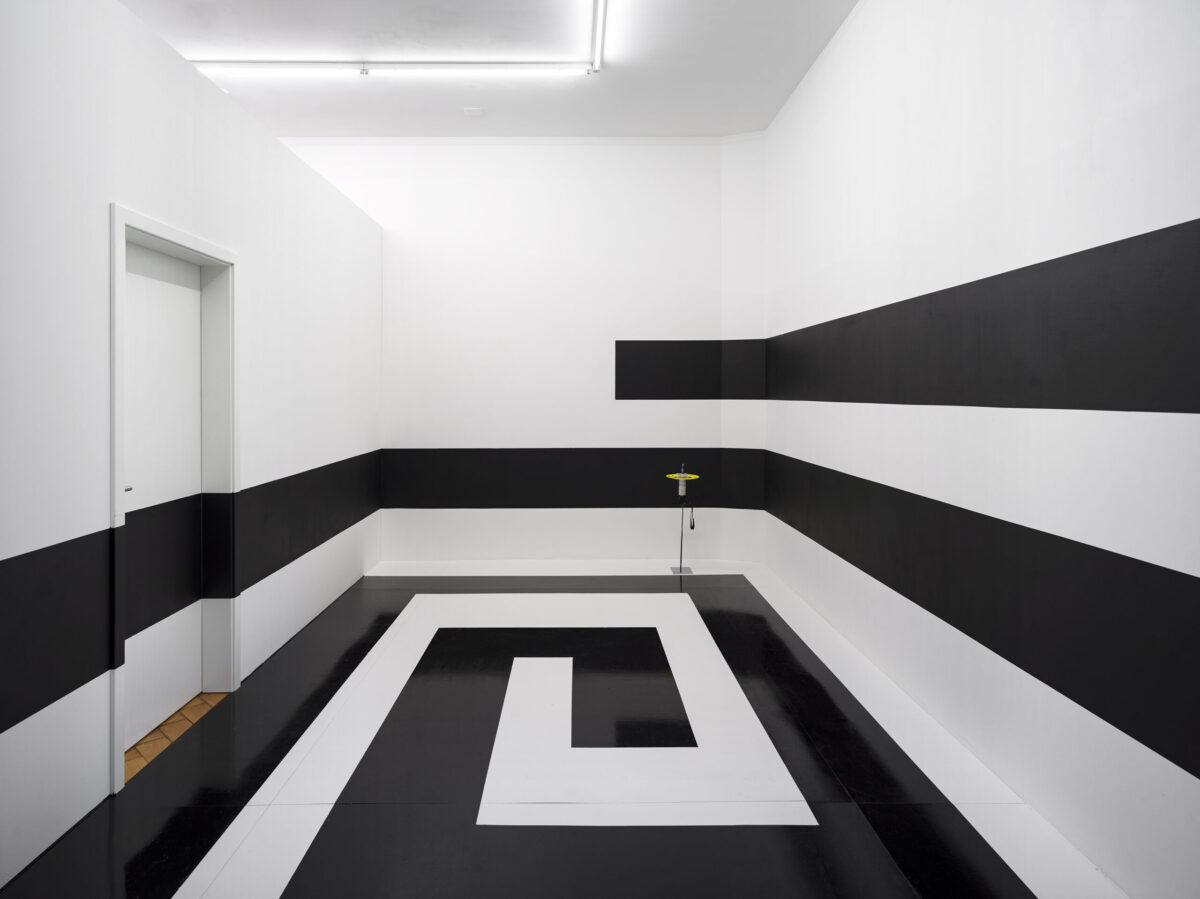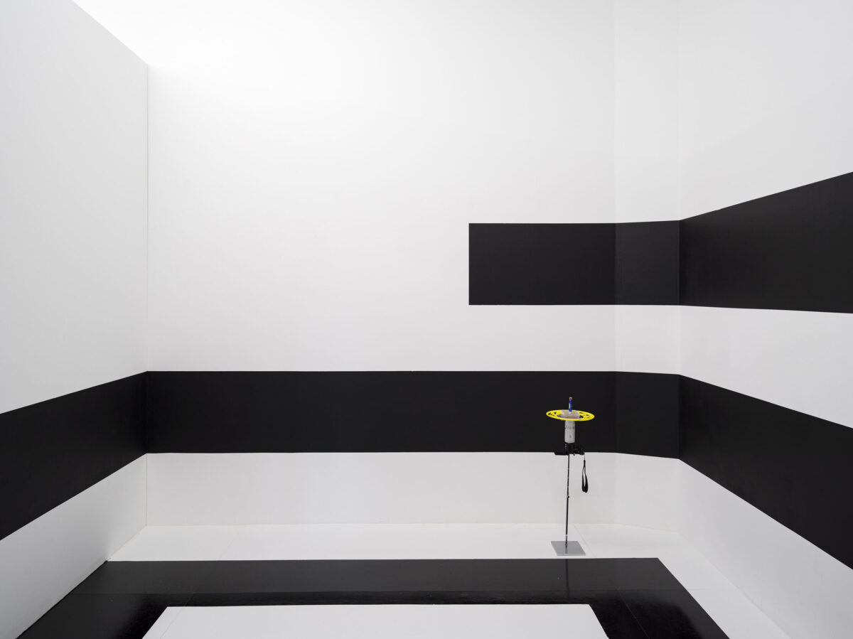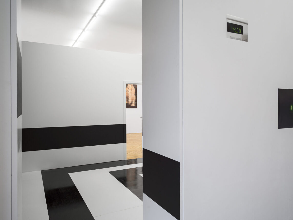 GRETCHEN LAWRENCEs Spirale, My Spiral (2022), füllt den Raum mit ihrer Geometrie. Die Wände und der Boden werden als Flächen genutzt, auf die schwarze Farbe aufgetragen wird, um eine gross angelegte Rauminstallation zu schaffen. Ihre Spirale füllt den Fussboden aus und wird an den Wänden weitergeführt. Zwei Räume entstehen auf den Oberflächen: der schwarze Raum und der weisse Raum. Dies könnte als positiver und negativer Raum verstanden werden oder als das, was ist und was nicht ist, beides sich windend und somit gleichzeitig existierend. Innerhalb der Installation befindet sich ausserdem eine Skulptur, die aus persönlichen Gebrauchsgegenständen oder gefundenen Objekten assembliert wurde, die lose mit gelebter Erfahrung in Verbindung stehen. Hier ist der Energydrink mit dem derben Namen «Pussy» auf eine Jewel-CD-Hülle und eine Digitalkamera geklebt. Was dabei in Erinnerung gerufen werden könnte, ist der erfinderische Teenage-Hedonismus, als das Kaufen von Alkohol nicht möglich war und das Trinken von zu viel Koffein das damalige High darstellte. Konsumpsychologie und Entwicklungspsychologie können manchmal miteinander verknüpft werden, wenn man an Teenager denkt.