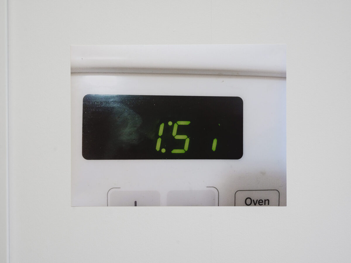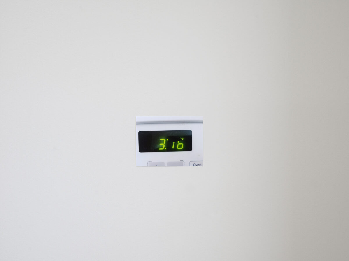 Time of Day (2017) ist eine Fotoserie von LULOU MARGARINE. Die Bilder zeigen die digitale Zeitanzeige auf dem Display eines Ofens zu unterschiedlichen Tageszeiten – bei Nacht und bei Tag. Der Ofen ist Objekt multipler Zwänge und Kontrollen. Er steht da in der Küche, jederzeit. Die Anzeige ändert sich mit jeder Minute. Die Produktion dieser Bilder erforderte einen Rhythmus, der asynchron zu der durch den Kapitalismus und seine Uhren strukturierten Zeit von Freizeit und (unbezahlter) Arbeit verläuft. Lulou Margarine sucht die Anzeige des Ofens zu jeder Tageszeit auf – eine unheimliche Anziehungskraft, wie das Insekt, das vom Licht angelockt wird. Die Uhr läuft synchron mit der Tageszeit und dem natürlichen Licht. Die Arbeit Time of Day beschreibt einen disparaten Zustand zwischen natürlicher und naturalisierter Zeit und verbindet einen unheimlichen, häuslichen Raum als Spiegel der Psyche mit dem weitreichenden Unterfangen, Zeit in messbare Einheiten zu strukturieren.