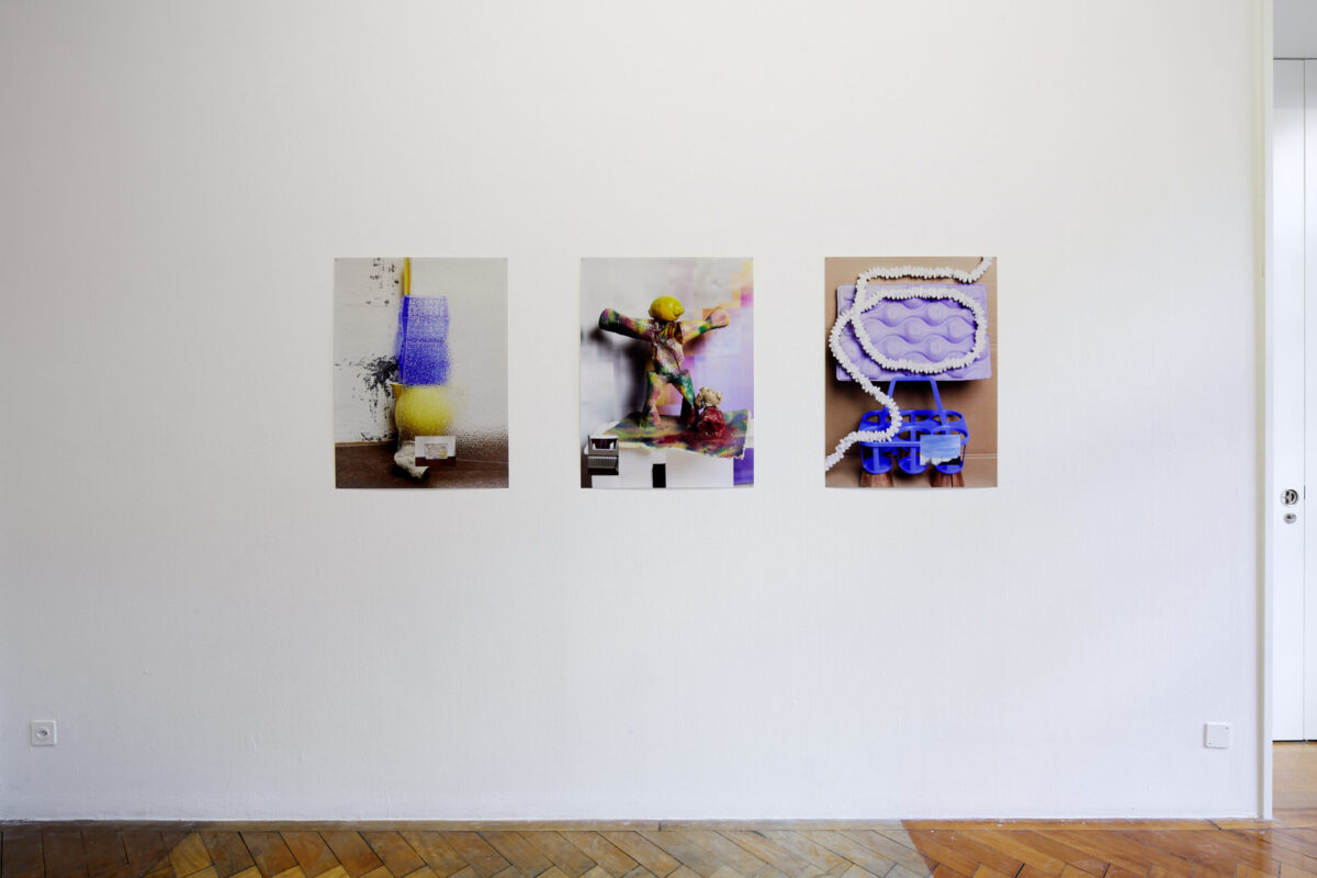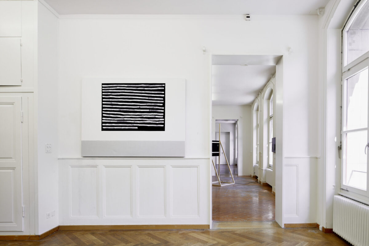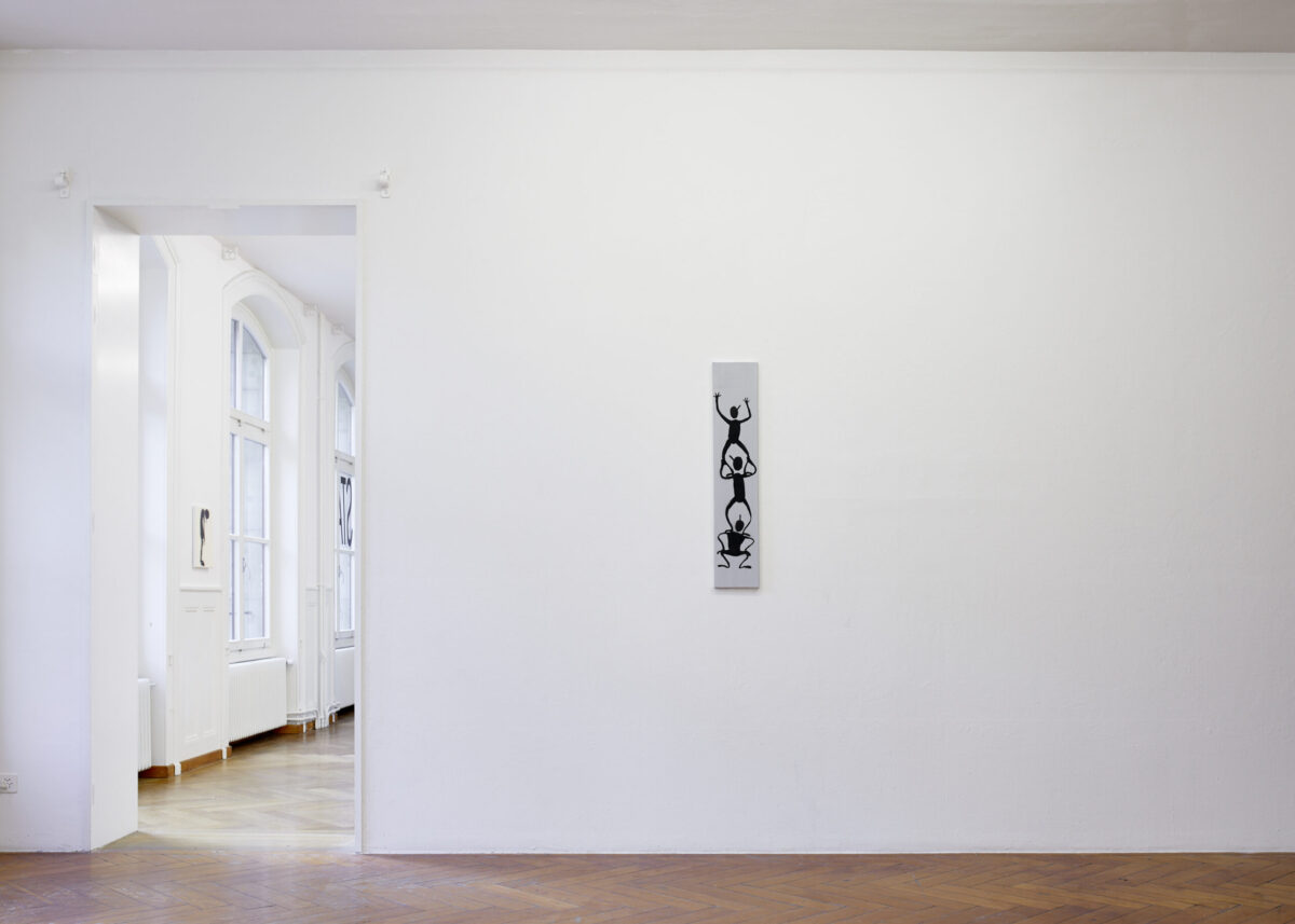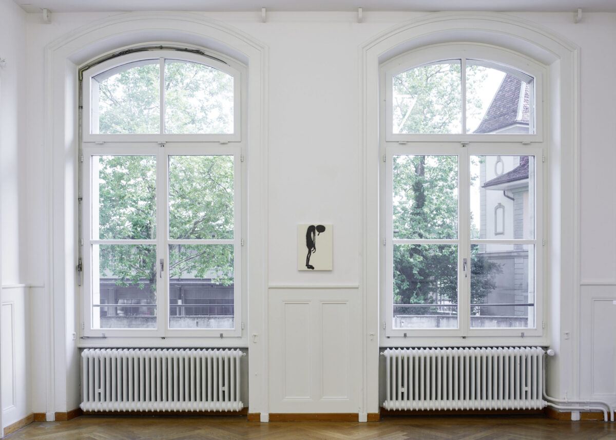 In den zwei Malereien To be titled (2017) von SEBASTIEN VERDON (*1979 in Stuttgart, lebt und arbeitet in Neuchâtel und Lausanne) ist ein angedeuteter Raum zu sehen. Dargestellt durch wenige Flächen, interpretiert Verdon verschiedene im Internet gefundene Ansichten von ihm unbekannten Ausstellungen. Der Charakter der Malereien greift dabei einen scheinbaren Stereotyp von Ausstellungsdokumentationen auf: Durch ihren nüchtern anmutenden Charakter verorten sich diese im idealisierten Ausstellungsdisplay des «White Cubes». Verdon interessiert sich für diese uniformierte Art der Kunstpräsentation, zumal die physische Erfahrbarkeit von Kunst durch digitale Plattformen heute scheinbar weniger wichtig wird. Verdon materialisiert diese «Entkörperung» als Objekte, die er in den realen Ausstellungsraum zurückbringt.