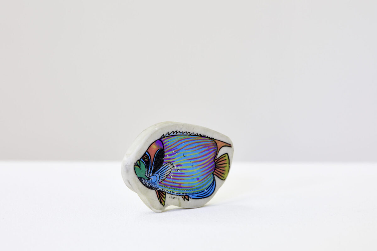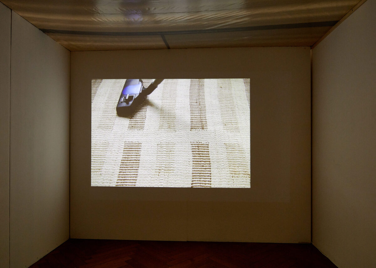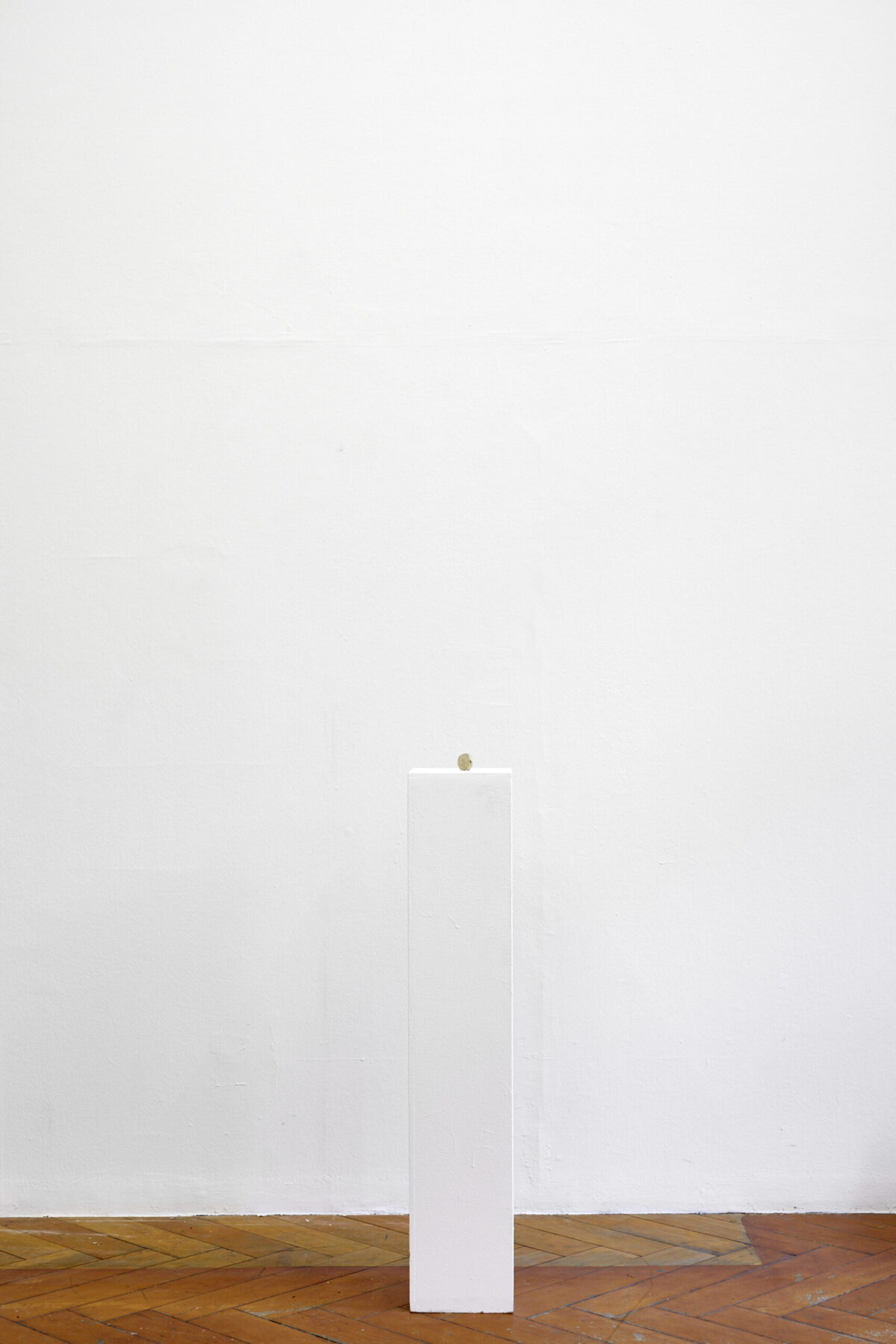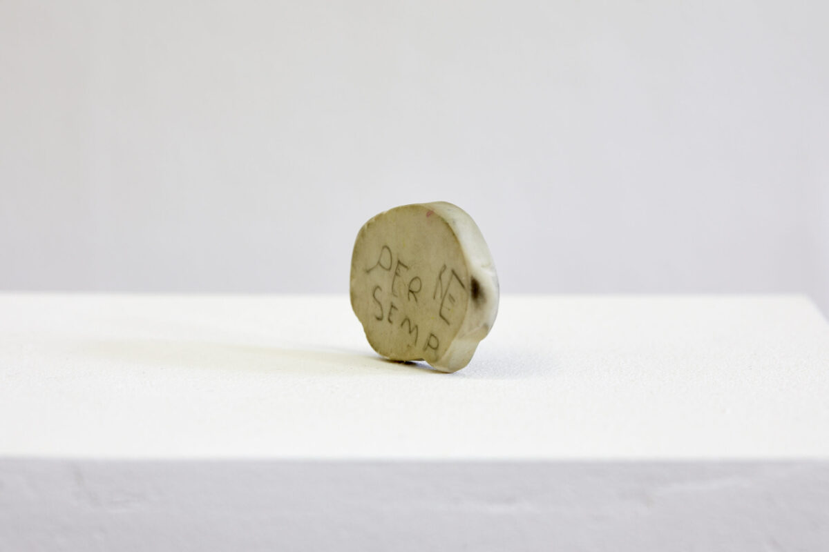 Das Objekt PER SEMP-RE von GIORGIA PIFFARETTI (*1989 in Mendrisio, lebt und arbeitet in Bern) stammt aus einer Sammlung persönlicher Gegenstände. Zu einem nicht genau bekannten Zeitpunkt in ihrer Kindheit hat Piffaretti den Radiergummi mit den Worten «für immer» versehen. Jahre später wird er in der Ausstellung platziert, wo er die Frage nach der Bedeutung der Zeit in Bezug auf ein Kunstwerk oder künstlerisches Schaffen stellt.