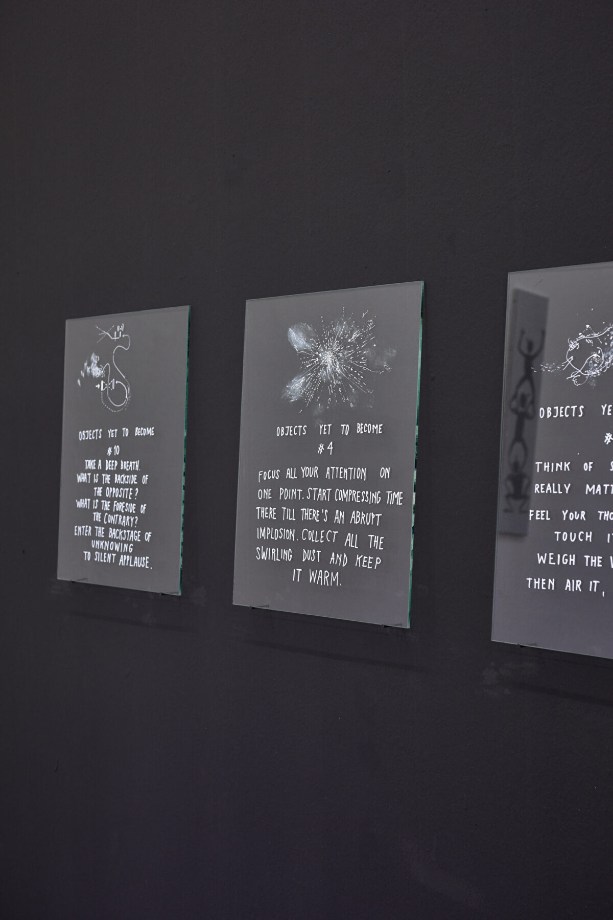 Die Arbeit Objects Yet To Become (2016–) von NIKOLAUS GANSTERER (*1974 in Klosterneuburg, lebt und arbeitet in Wien) ist eine Serie, die sich aus textlichen und zeichnerischen Elementen zusammensetzt. Durch einfache, poetische Aufforderungen werden die Text-Bild-Kombinationen zu Anleitungen, welche durch die Betrachterin im Ausstellungs- oder Privatraum ausgeführt werden können. Durch diese Aktion wird die vom Künstler geschaffene Ausgangslage aktiviert und seine Imagination durch das Publikum vollzogen.