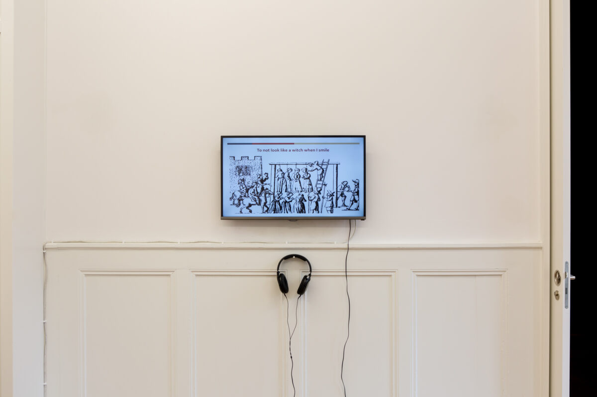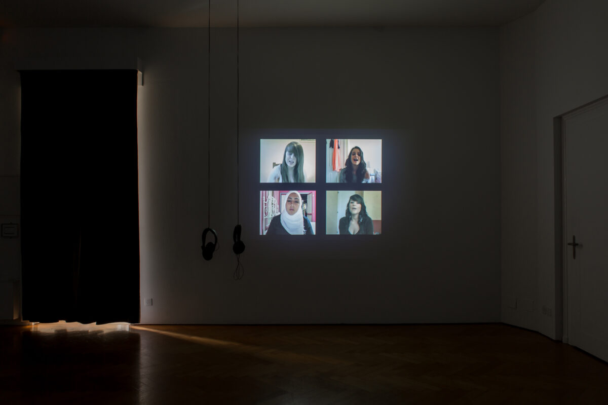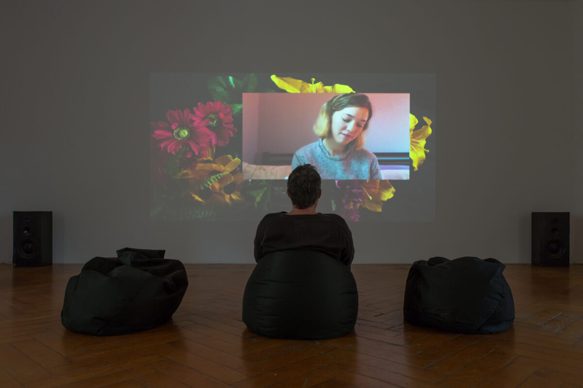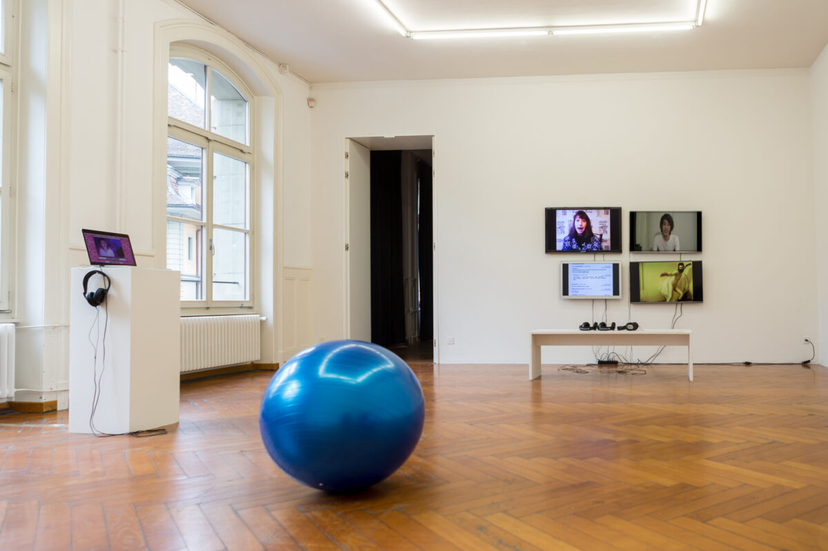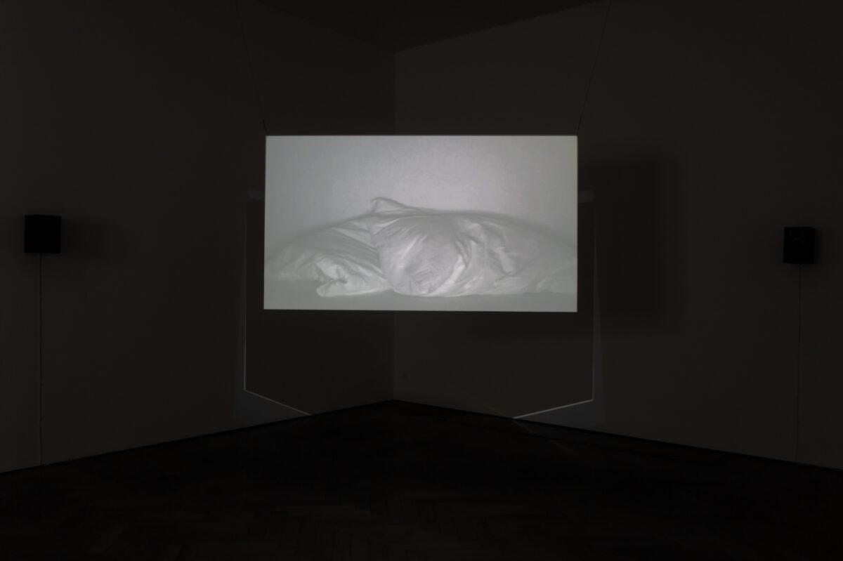 Im letzten Raum der Ausstellung erwarten uns zwei Videoinstallationen von CAMILLE KAISER. In Someone Like You (2013) blicken uns vier junge Frauen entgegen, welche die gleichnamige Ballade der britischen Musikerin Adele singen. Kaiser hat die Videos im Internet gefunden und zusammengeschnitten. Der einfühlsame Song wird so zur aufdringlichen Kakophonie aus Stimmen, die nicht harmonieren wollen, obwohl die Vorlage der Interpretation dieselbe ist. Die Arbeit zeigt den schwierigen Spagat zwischen Individualität und Mainstream, mit der sich junge Erwachsene heutzutage konfrontiert sehen. I Love You, Good Night (2015) ist ein Einblick in ein intimes Gute-Nacht-Gespräch. Zwei schläfrige Stimmen erzählen sich im Flüsterton von ihrem Arbeitstag und tauschen Zärtlichkeiten aus. Am Anfang noch kohärent, driftet das Gespräch allmählich auseinander. Auch diese Arbeit ist eine Collage aus Tonspuren von Youtube-Videos, die mit dem Schlagwort ASMR betitelt werden. In der Form des Rollenspiels vollzogen, suggeriert das Video menschliche Nähe und wird zum Substitut für die reale Beziehung. Das persönliche Bettgespräch wird so zum konsumierbaren Gut.