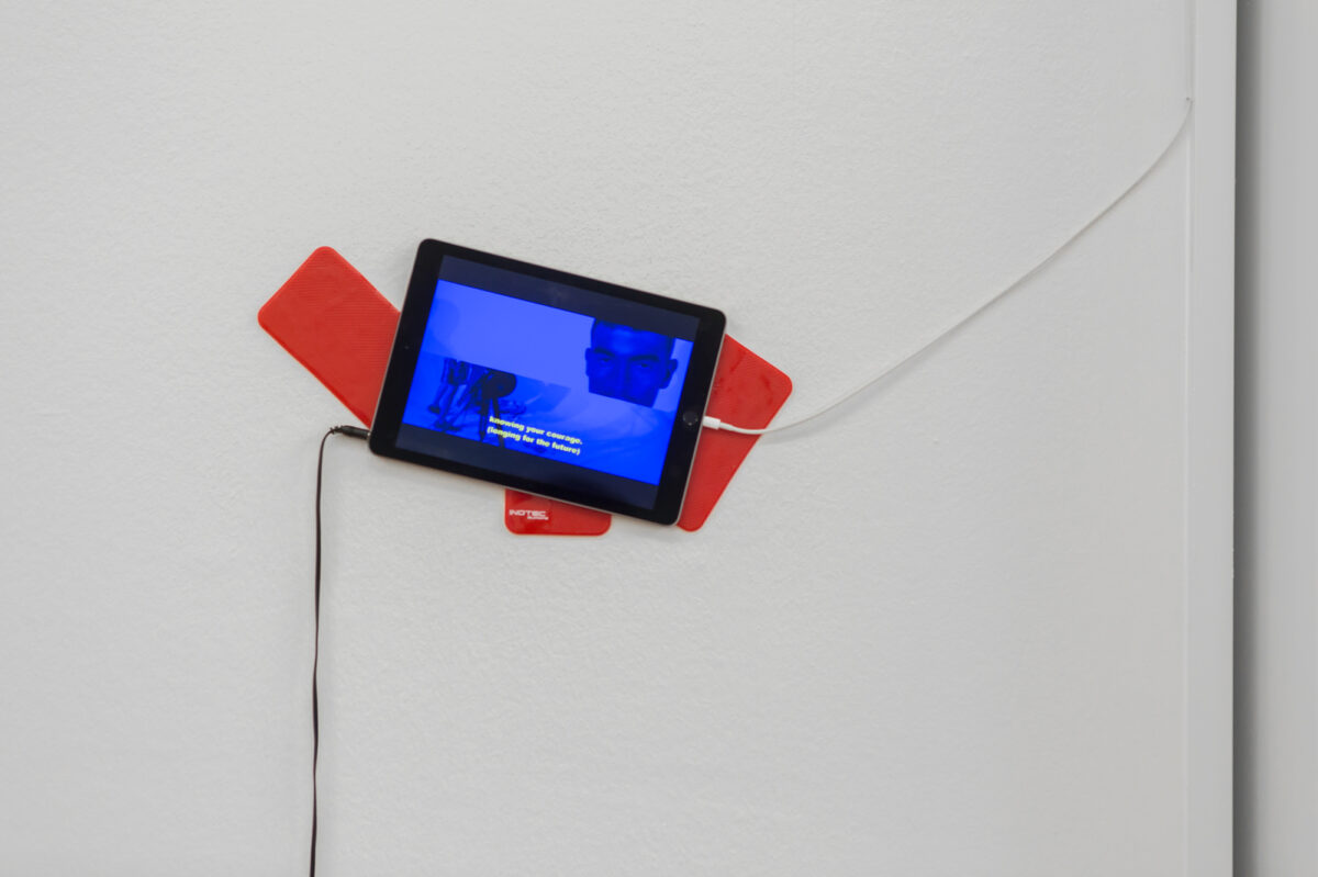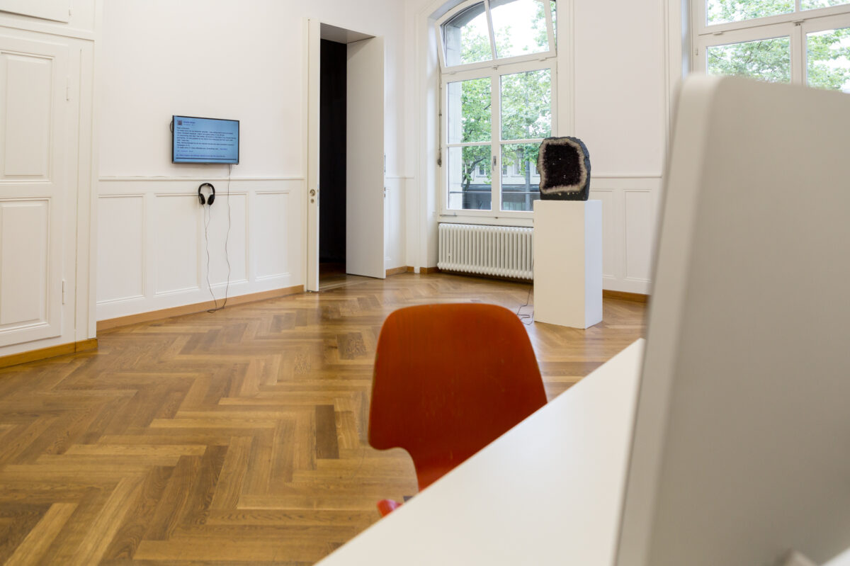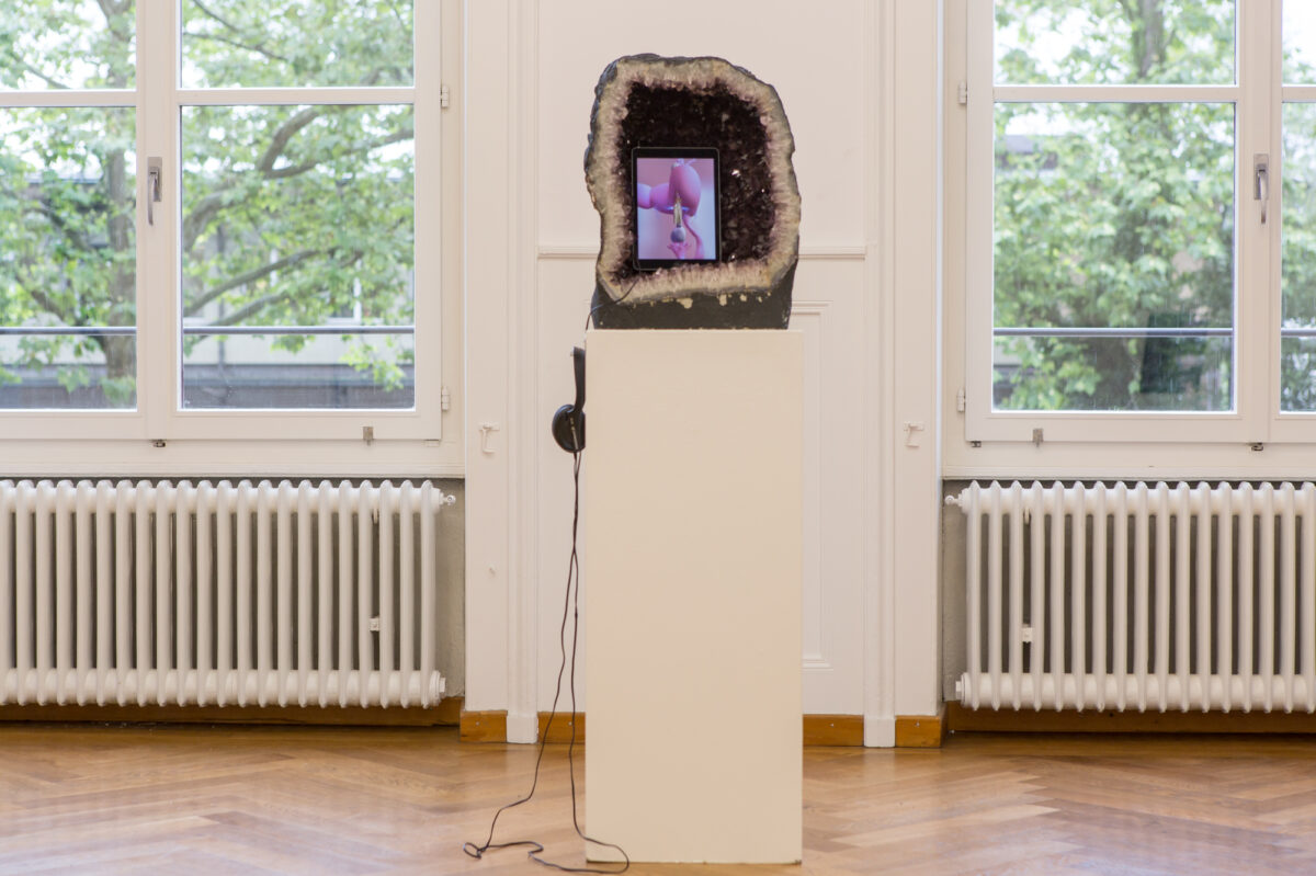 «Welcome to my world. A world where we are not affected, scared, hurt, where we do not care about white supremacy, homophobia, transphobia, fatphobie, mysogyny, patriarchy…». Dies sind die Worte, mit denen uns TABITA REZAIRE (*1989 in Paris, lebt in Johannesburg) in ihrer Arbeit Peaceful Warrior (2015) begrüsst. Die Künstlerin erscheint auf dem Screen des iPad, tanzt und vollzieht Yogaübungen vor einem sich wechselnden, digital surrealen Hintergrund, der an ein Videospiel erinnert. Rezaire nennt ihr Rezept «Decolonial Self Care» und zeigt in mehreren Schritten, wie man durch Yoga, Meditation und radikale Selbstliebe in den Zustand des «Peaceful Warrior» gelangen kann. Laut Rezaire liegt der Weg für die Befreiung aus dem patriarchalen, homophob-konservativen System in der Kraft der Weiblichkeit. Ideen aus der tantrischen Philosophie mischen sich mit einer cyberfeministischen-popdigitalen Ästhetik. Die Präsentationsform in der Amethystdruse veräussert die in der Arbeit gezeigten Glaubenssätze an Energien und Kräfte der Natur, die in uns weilen und die es zu aktivieren gilt.