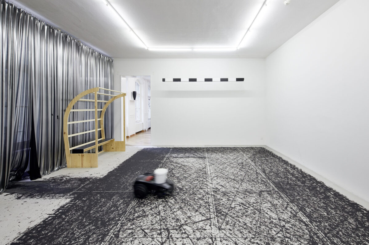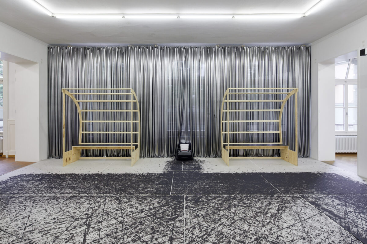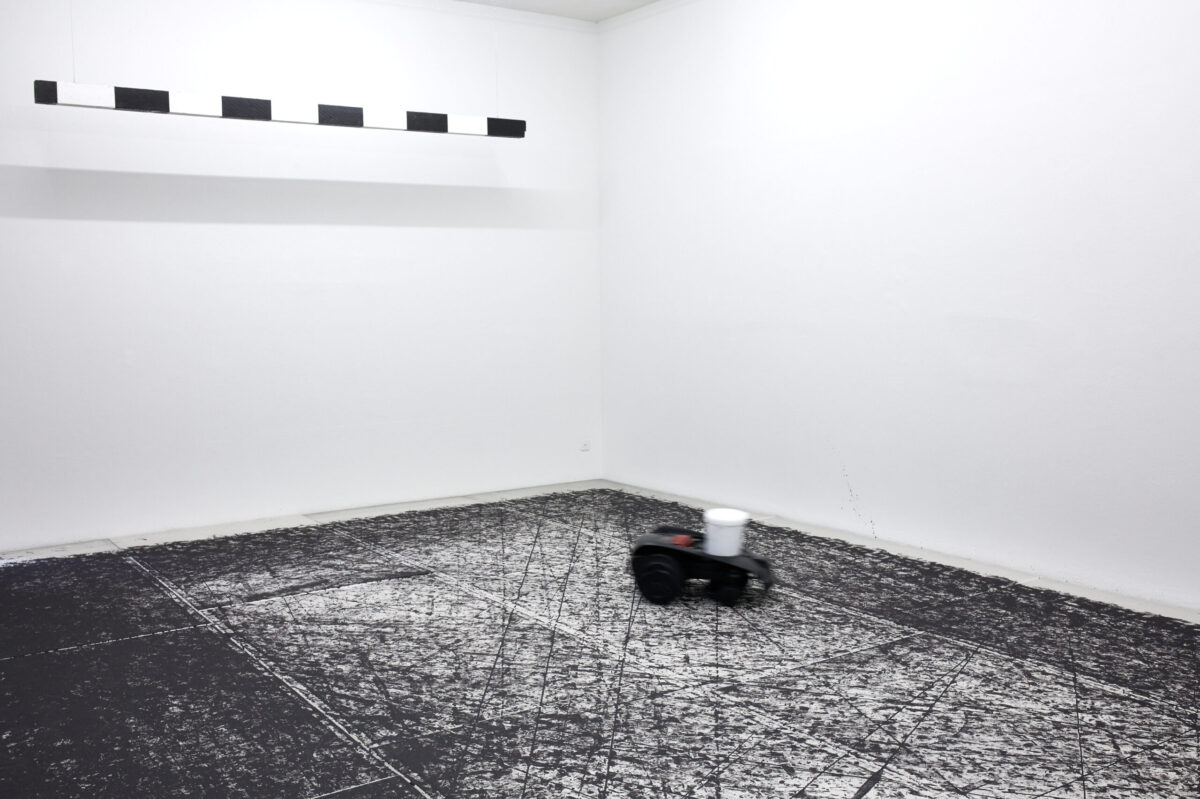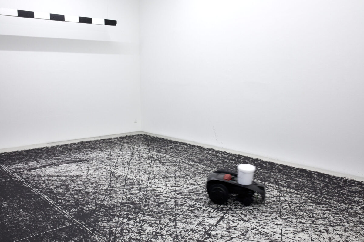 Betritt man die Stadtgalerie, landet man als erstes in einem Kabinett voller Pokale. Welche Siege damit wohl ausgezeichnet wurden? Im zweiten Raum betritt man dann die Installation Tigre contro Tigre. Ein umgebauter Rasenmäher malt endlos Spielzüge auf ein von einem mäandernden Muster umgrenztes Feld und kommt ab und zu in die Nähe der angedeuteten Tore. Wie riesige Fliesen bedecken die Gipsplatten den gesamten Holzboden, und hinterlassen ein Gefühl der Unsicherheit beim Gehen. Zwei Reservebänke laden ein zum Verweilen und Beobachten des Spiels, während im Hintergrund ein Rauschen den Spieler antreibt. Salafia hat dafür das Bullern des Holzofens in seinem Atelier aufgenommen. Das Geräusch verbindet er mit dem Gefühl von Energie und Vorwärtsgehen. Als Ausstellungsbesuchende sind wir ebenso Teil der Geschichte als auch aussen vor gelassen. Letztendlich bleibt offen, wer die beiden Tiger sein könnten, die sich gegenüberstehen und ob der angedeutete Held mit seinen Auszeichnungen aus dem Sport oder der Kunst kommt.