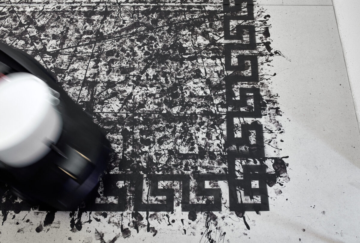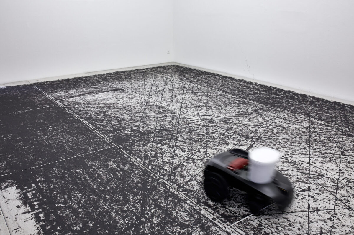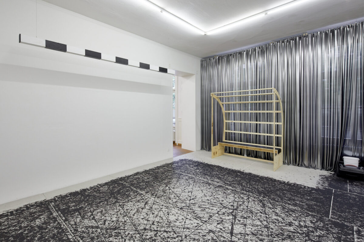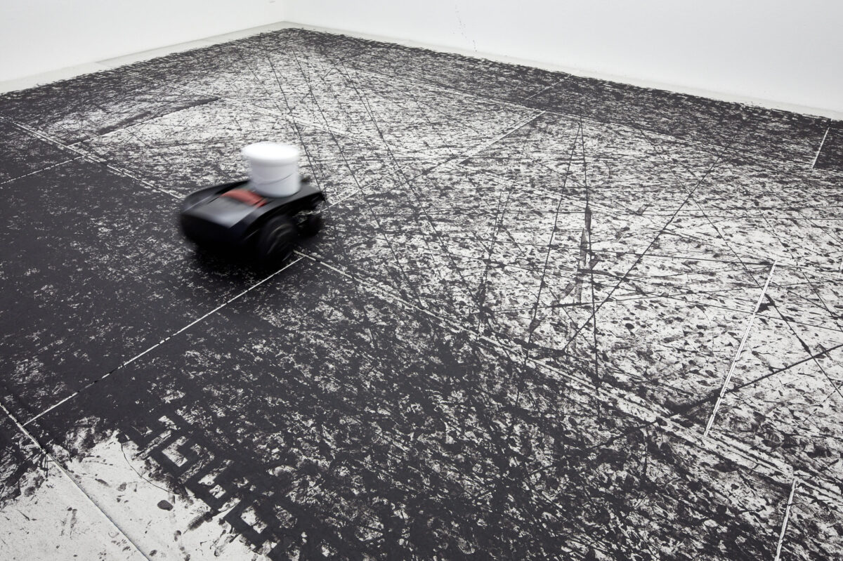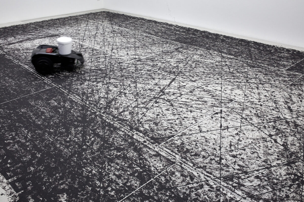 Betritt man die Stadtgalerie, landet man als erstes in einem Kabinett voller Pokale. Welche Siege damit wohl ausgezeichnet wurden? Im zweiten Raum betritt man dann die Installation Tigre contro Tigre. Ein umgebauter Rasenmäher malt endlos Spielzüge auf ein von einem mäandernden Muster umgrenztes Feld und kommt ab und zu in die Nähe der angedeuteten Tore. Wie riesige Fliesen bedecken die Gipsplatten den gesamten Holzboden, und hinterlassen ein Gefühl der Unsicherheit beim Gehen. Zwei Reservebänke laden ein zum Verweilen und Beobachten des Spiels, während im Hintergrund ein Rauschen den Spieler antreibt. Salafia hat dafür das Bullern des Holzofens in seinem Atelier aufgenommen. Das Geräusch verbindet er mit dem Gefühl von Energie und Vorwärtsgehen. Als Ausstellungsbesuchende sind wir ebenso Teil der Geschichte als auch aussen vor gelassen. Letztendlich bleibt offen, wer die beiden Tiger sein könnten, die sich gegenüberstehen und ob der angedeutete Held mit seinen Auszeichnungen aus dem Sport oder der Kunst kommt.