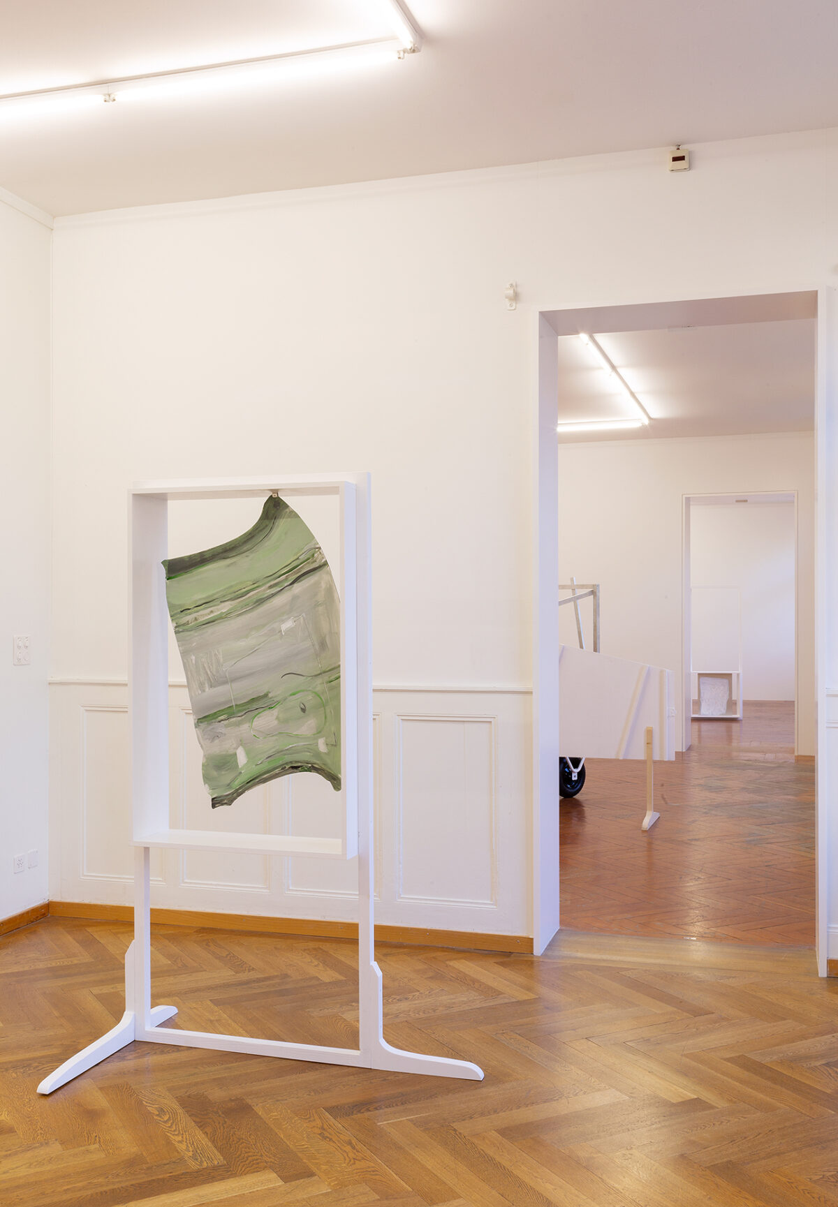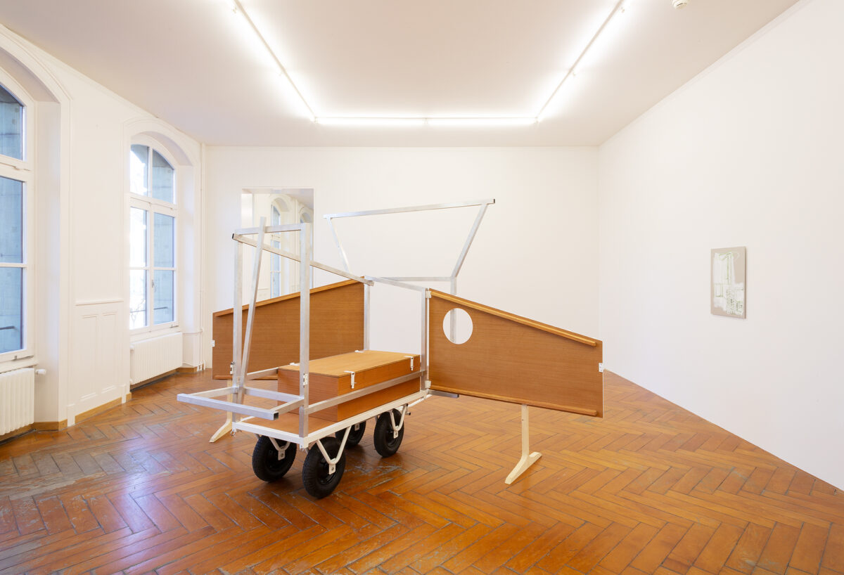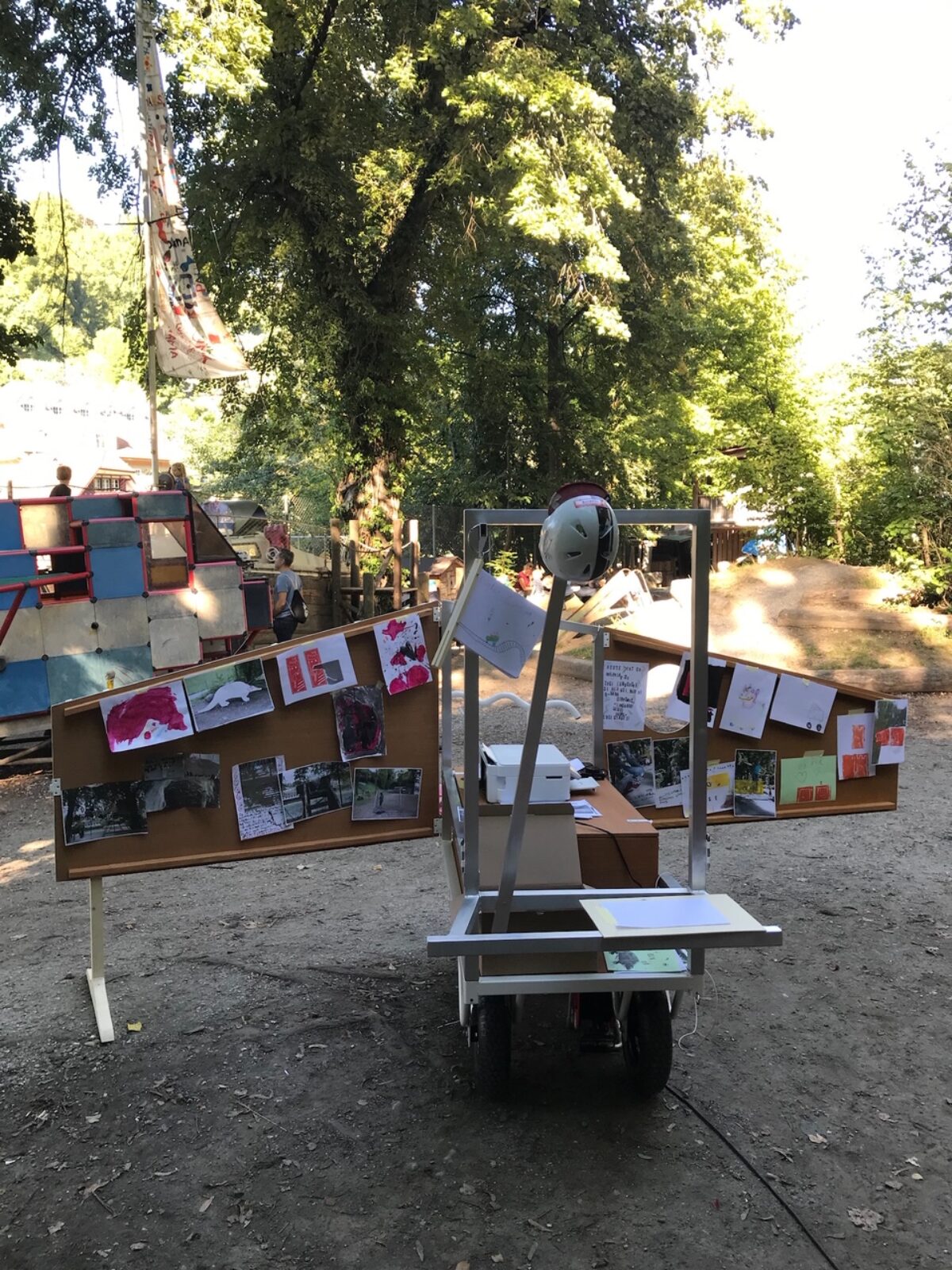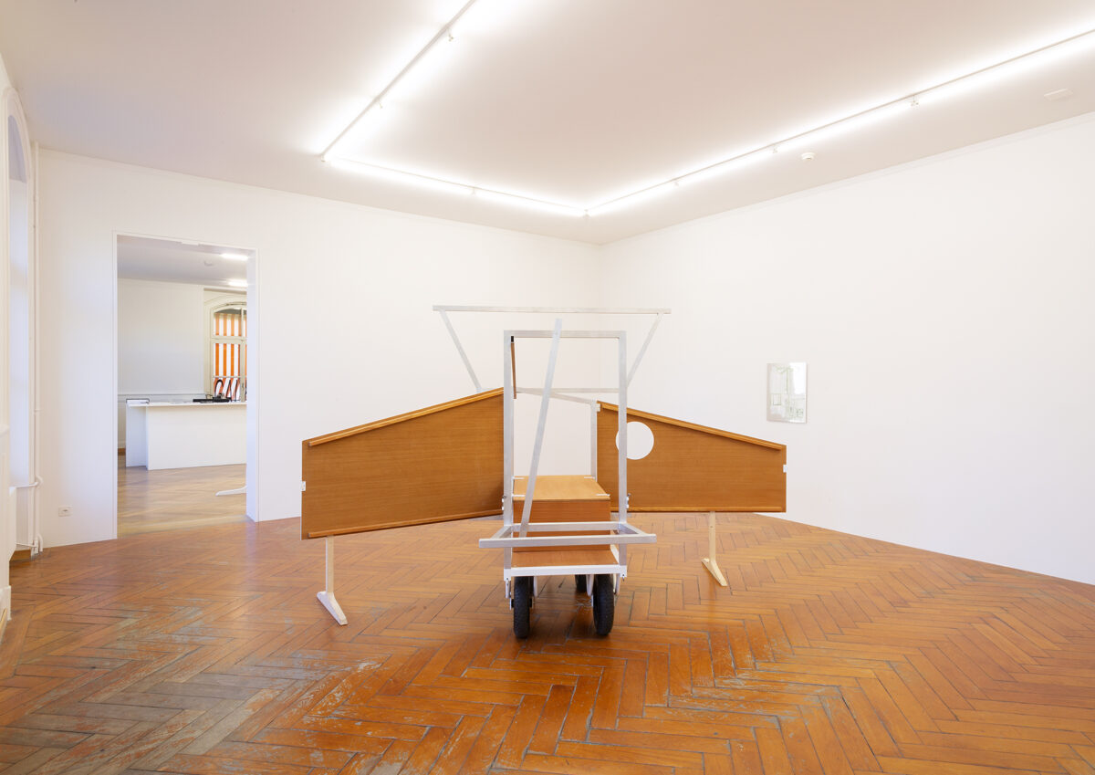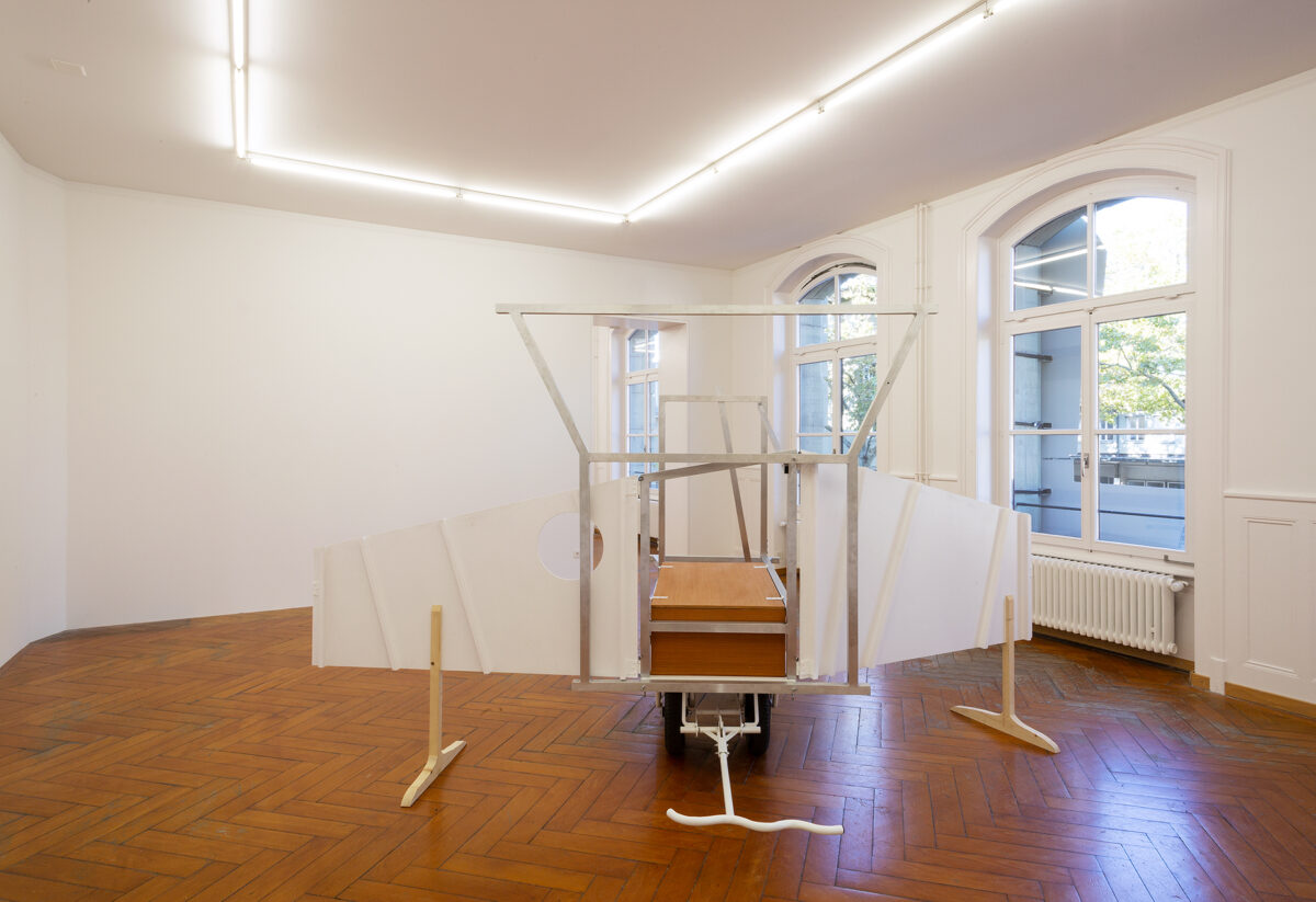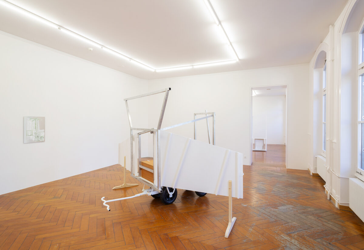 Für die Ausstellung ist ein Spielwagen entstanden, der Skulptur und gleichzeitig erweitertes künstlerisches Handlungsfeld ist: Auf dem Spielplatz Längmuur und dem Spielplatz am Schützenweg – Erben der Freien Pädagogik in Bern – werden damit Aktionen mit Kindern stattfinden. In Baumgartners Verständnis der Kunstproduktion gibt es einen ökologisch-ökonomischen Aspekt, der sich unter anderem auch in der Anschlussfähigkeit ihrer Malereien widerspiegelt. Gemeint ist die Möglichkeit der Weiterverwendung von Teilen ihrer Arbeit in neuen Installationen und Aktionsräumen. So wird der Spielwagen, der für die Ausstellung in der Stadtgalerie entstand, weiterreisen und zum Ausgangspunkt für kommende Aktionen mit Jugendlichen und Kindern werden.