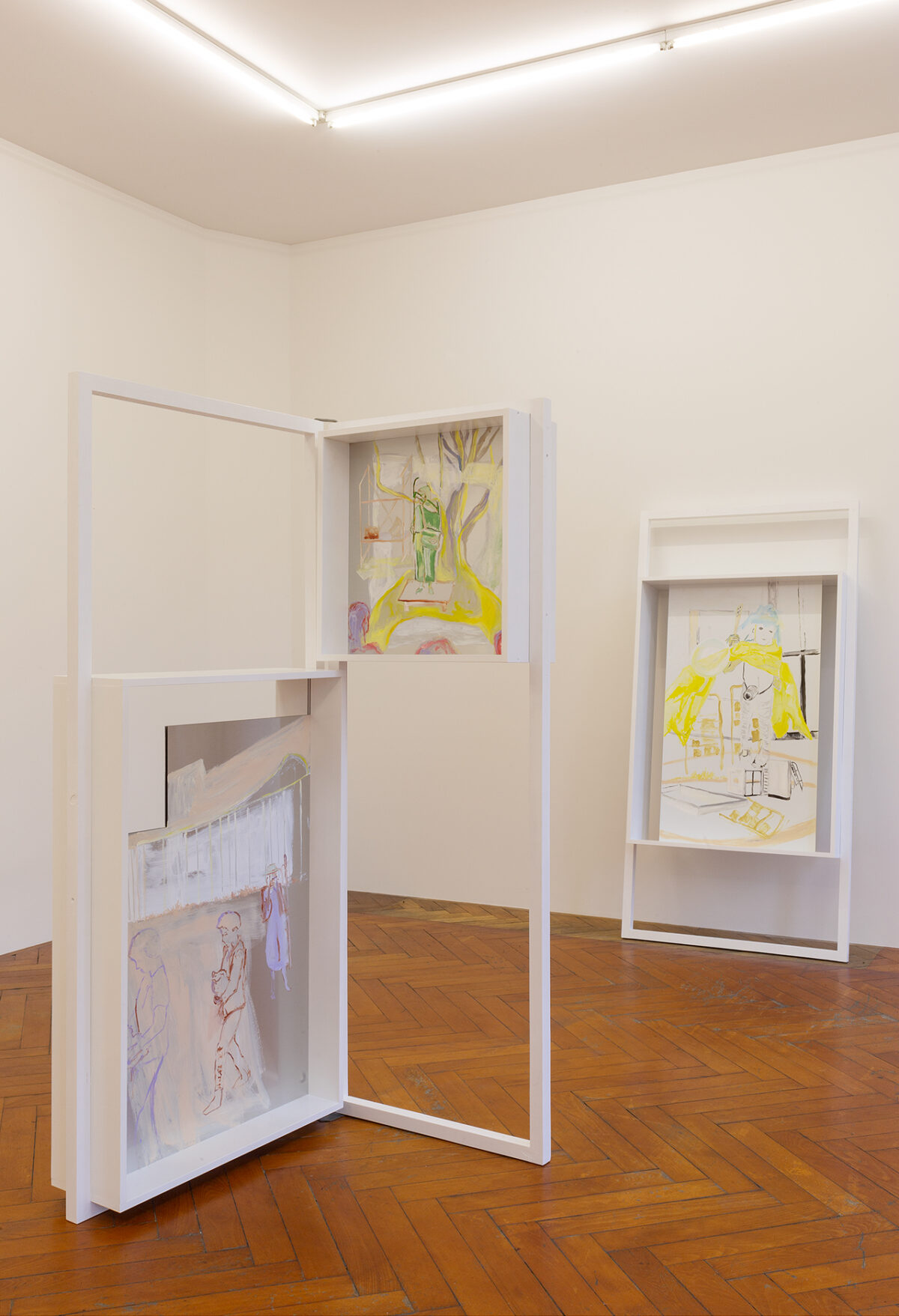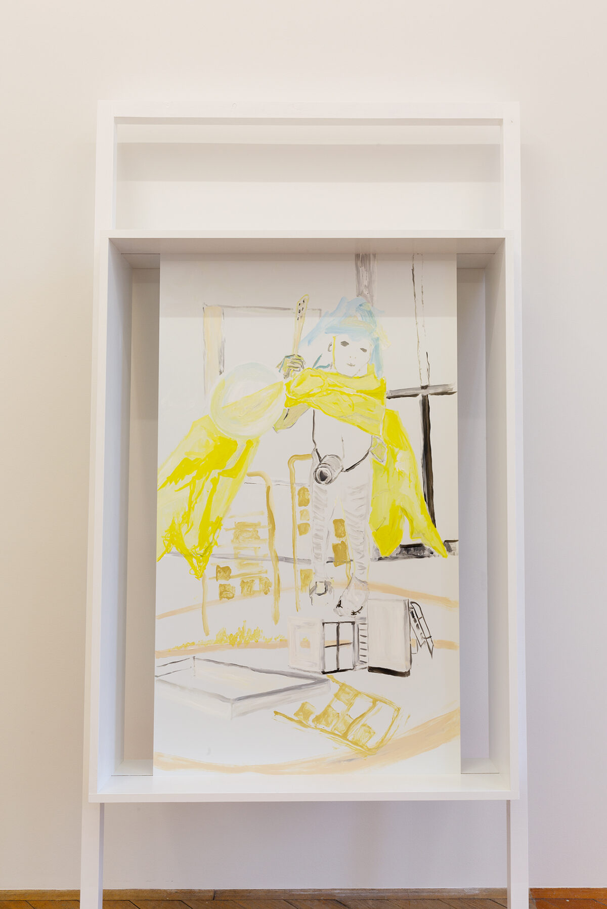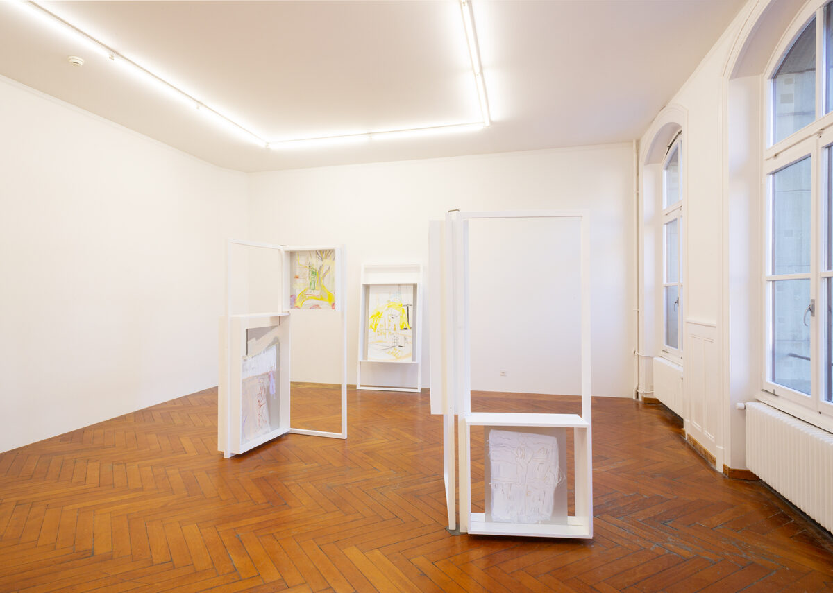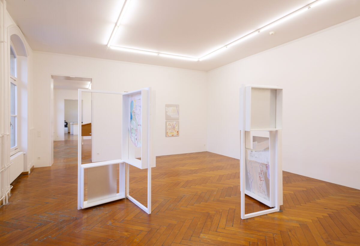 In der Ausstellung Viele Vampire sind Vögel steht Baumgartners Arbeit mit pädagogischen Spielsettings im Zentrum. Die in der Stadtgalerie gezeigten Malereien sind Archiv vergangener Aktionen, und deuten zugleich das Potential an, sich zukünftig zu neuen Aktionssettings zu formieren. Wohnblöcke verweben sich in den Bildern mit Bühnenelementen und temporären Architekturen; Kinder und Pädagog*innen sind in wechselnden Rollen-, Zuschauer*innen- und Akteur*innen-Verhältnis zu sehen. Die Beziehung zwischen diesen Elementen bleibt innerhalb der Bilder unklar, und verweist dadurch auf den Möglichkeitsraum der Aktion und Performance, in denen diese Verhältnisse immer wieder von neuem verhandelt werden müssen.