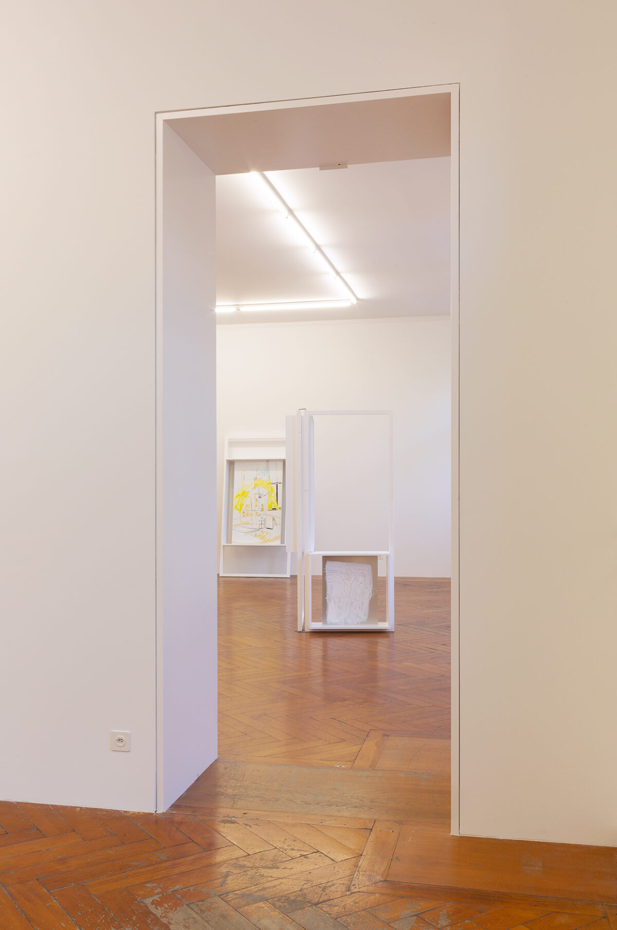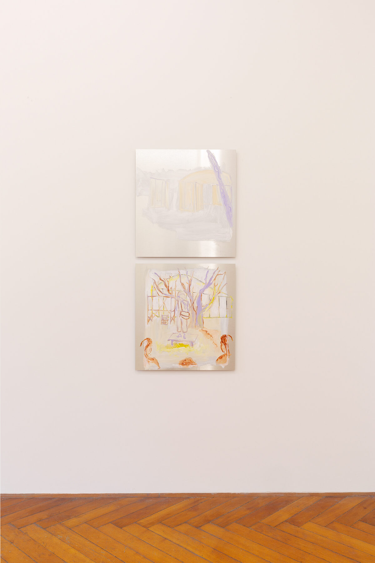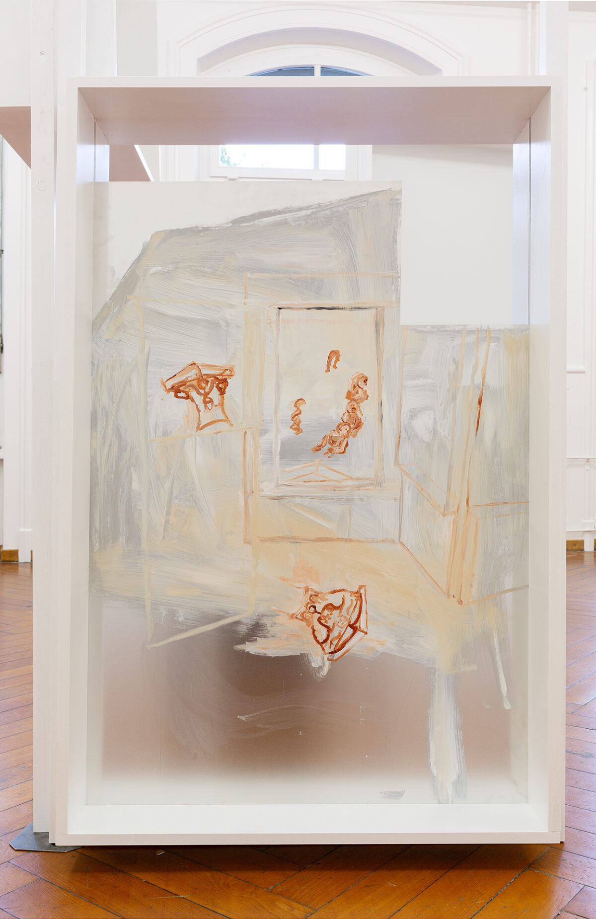 In der Ausstellung Viele Vampire sind Vögel steht Baumgartners Arbeit mit pädagogischen Spielsettings im Zentrum. Die in der Stadtgalerie gezeigten Malereien sind Archiv vergangener Aktionen, und deuten zugleich das Potential an, sich zukünftig zu neuen Aktionssettings zu formieren. Wohnblöcke verweben sich in den Bildern mit Bühnenelementen und temporären Architekturen; Kinder und Pädagog*innen sind in wechselnden Rollen-, Zuschauer*innen- und Akteur*innen-Verhältnis zu sehen. Die Beziehung zwischen diesen Elementen bleibt innerhalb der Bilder unklar, und verweist dadurch auf den Möglichkeitsraum der Aktion und Performance, in denen diese Verhältnisse immer wieder von neuem verhandelt werden müssen.