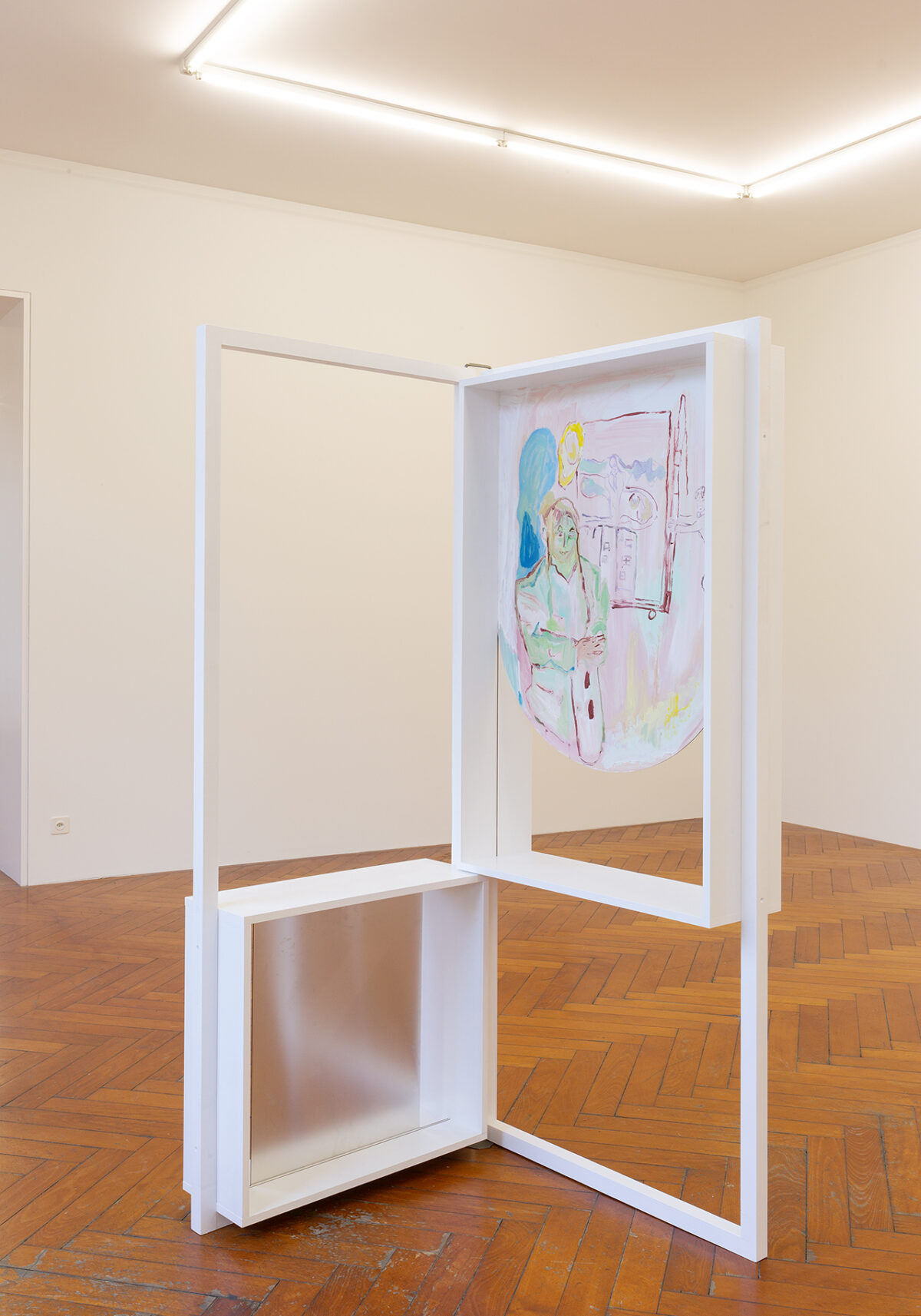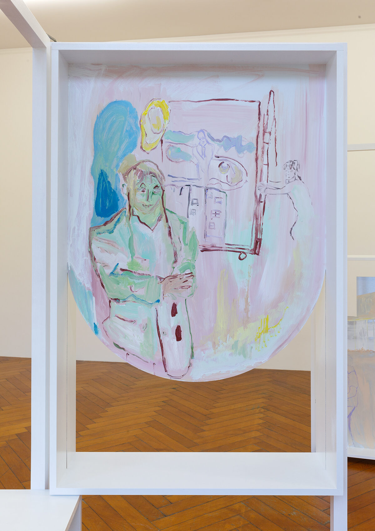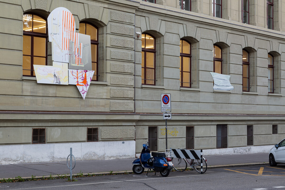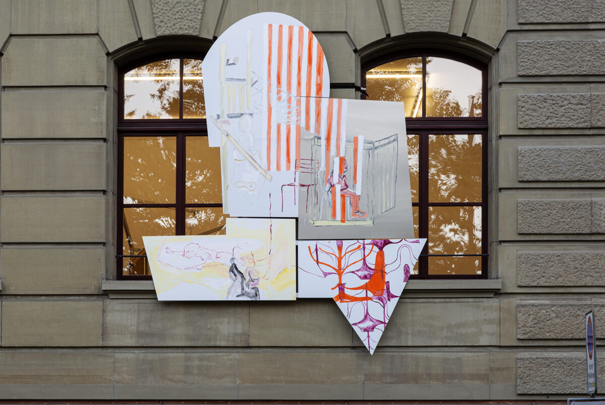 In den Räumen der Stadtgalerie zeigt die Künstlerin ihre Malereien in einem veränderbaren Displaysystem. Die Möglichkeit eines Kontextwechsels ist auch bereits in der Materialität der Bilder angelegt: Lackfarbe und Alu Dibond als Bildträger erlauben die Verwendung und Präsentation im Aussenraum. Das mehrteilige Wandbild an der Fassade der Stadtgalerie, das für diese Ausstellung entstanden ist, führt das vor. Die bemalten Paneele erweitern die Ausstellung nach aussen hin und markieren die verschiedenen institutionellen Räume – das ehemalige Progymnasium, die gegenüberliegende Polizei, Spielplatz, privates Heim – und behaupten die Malerei als einen alltäglichen Handlungsraum. Ein Anliegen das sich in den gemalten, gestreiften Markisen artikuliert, die einerseits die Storen des Gebäudes aufnehmen, andererseits an die vertikalen Streifen des Künstlers Daniel Buren erinnern. Ein anderes Paneel zeigt Doris Stauffer als Hexe. Die Künstlerin und Lehrende leitete ab 1977 den «Hexenkurs» für Frauen an der F + F Schule für experimentelle Gestaltung in Zürich. Emanzipatorische Möglichkeiten kritischer und feministischer Pädagogik sind auch bei Baumgartner zentrale Fragestellungen einer Praxis, welche die festen Trennlinien zwischen Kunstproduktion und deren Vermittlung immer wieder hinterfragt. Gusto Gräser, Wanderpoet, Reformer und Mitbegründer des Monte Verità ist eine andere Bezugsfigur, die in den Malereien in den Ausstellungsräumen der Stadtgalerie erscheint, und in deren Rolle die Künstlerin tritt. Gräser ist eine Künstlerfigur die bereits in anderen kollaborativen Zusammenhängen auftaucht, die Baumgartner initiiert hat, wie zum Beispiel dem Performativen Gusto Gräser Kinder-Archiv. Sein Leben und Werk ist Ausgangslage für die Befragung und Erweiterung durch Kinder und Jugendliche. Innerhalb ihrer pädagogischen und künstlerischen Arbeit benutzt Baumgartner Mittel einer fortlaufenden Geschichtsschreibung von unten mit malerischen und performativen Mitteln.