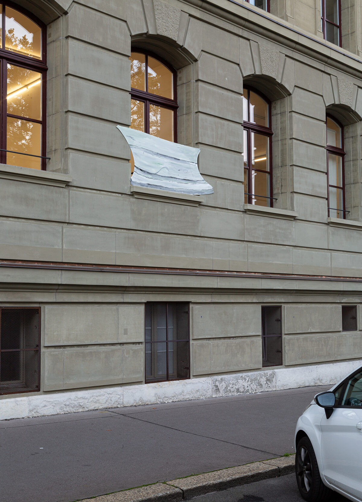 Das Bild Der Chindlifresserbrunnen ohne Chindlifresser (2019) zeigt Versatzstücke des in der Berner Altstadt stehenden «Chindlifrässerbrunnens», eine Kinderschreckfigur aus dem 16. Jahrhundert und fester Bestandteil des historischen Stadtbilds. Zu sehen sind das tragende Kapitell und Fundament des Berner Brunnens. Die Figur des Kinderfressers hat Baumgartner bewusst ausgespart. Jene Figur, deren antijüdischer Hintergrund zwar historisch nicht eindeutig geklärt ist, diese Unklarheit bis heute aber auch nicht Teil der öffentlichen Repräsentation der Skulptur ist. Das Bild schliesst an Baumgartners Praxis an, mit den (selbstreflexiven) Mittel der Malerei staatliche Repräsentationsräume und deren post-demokratische und rechte Unterhöhlung zu untersuchen. In Courtroom #1 – #3 beispielsweise beschäftigte sich Baumgartner zusammen mit Alex Wissel wie sich rechte, rassistische Strukturen in Räumen der öffentlichen Rechtsprechung einschreiben. In dieser Werkserie versuchen sie in Kooperation mit wechselnden Autor*innen eine Form der Gegenöffentlichkeit zu schaffen, indem sie zeigen, was zum Teil nicht medial repräsentiert und damit nicht gehört und nicht gesehen wird. Das Interesse, den vermeintlich entpolitisierten Raum mit künstlerischen Mitteln (wieder als politisch) erfahrbar zu machen, ist ein zentrales Anliegen von Baumgartners Praxis.