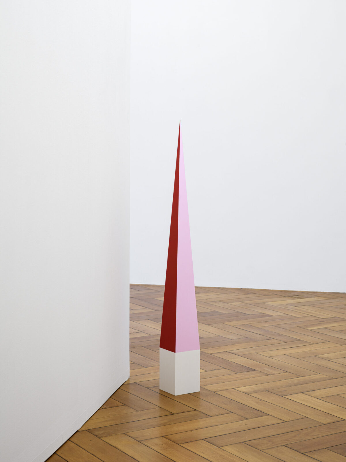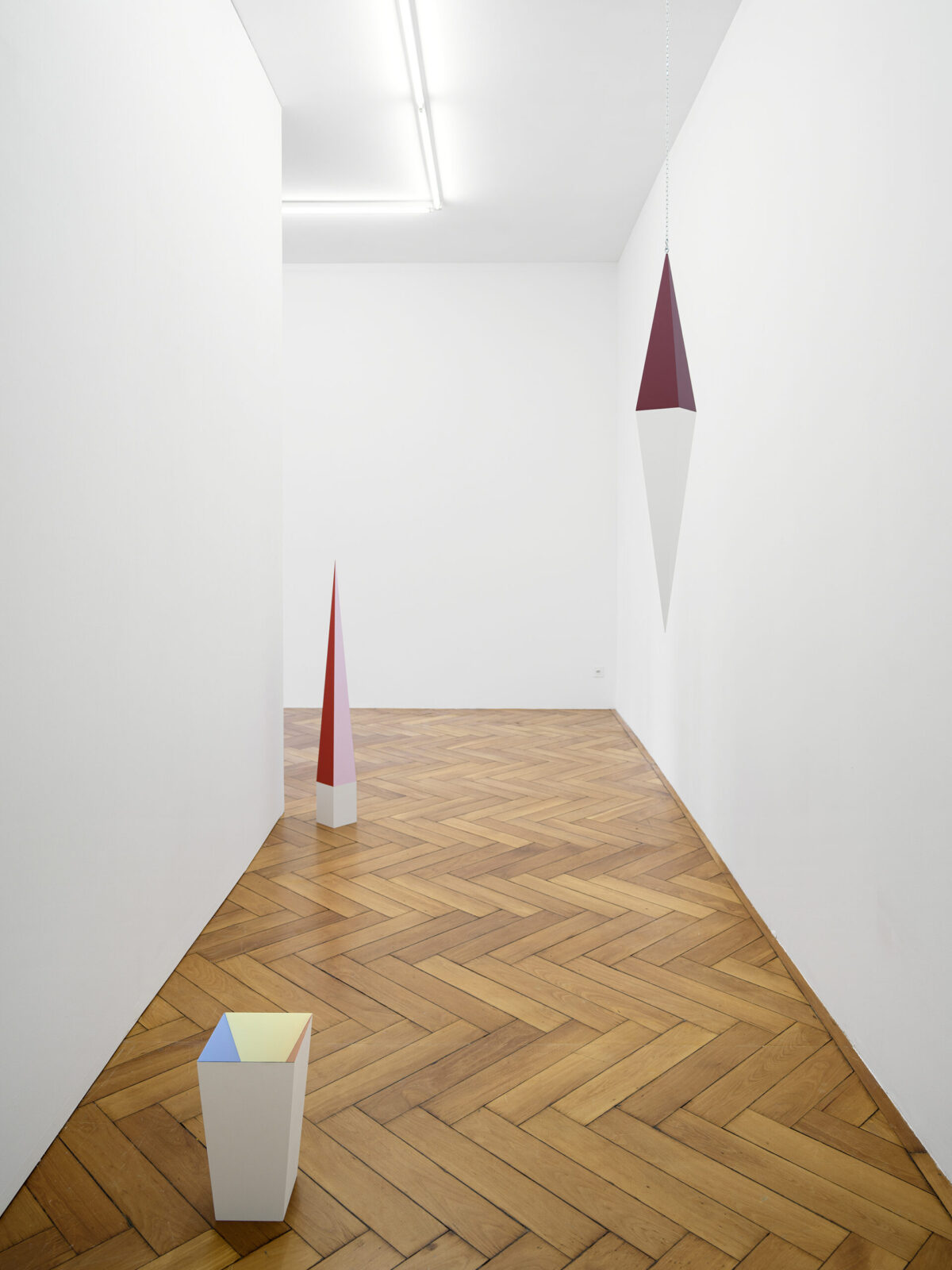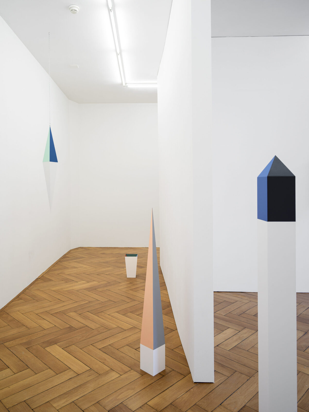 Die Arbeit Silent Monitor 1-4 (2023) ist nach dem gleichnamigen Konzept des Unternehmers, Sozialreformers und Philanthropen Robert Owen (1771–1858) benannt. Owen, der sich gegen die damals übliche, körperliche Züchtigung einsetzte, führte in seiner Fabrik eine Form der Disziplinierung ein, die auf einer für alle sichtbaren Validierung der Arbeiter*innen beruhte. Owens Silent Monitor hatte die Form eines Quaders, der in eine Pyramidenform überging, wobei jede der vier Seiten mit einer anderen Farbe versehen war, die für die Bewertung der Arbeiter*in stand. Die Disziplinarisierung und Validierung der eigenen Arbeit wurde nunmehr verinnerlicht. Die Künstlerin erweitert das Formen- und Farbenrepertoir des Originals und überführt sie ins Skulpturale. Karen Amanda Moser setzt dem Original eine Neudeutung gegenüber und entwirft weitere Kombinationen, die sich auf unterschiedliche Modelle von Arbeit im zeitgenössischen Kapitalismus beziehen. Von der körperlichen Fabrikarbeit, zu Dienstleistung, Emotionsarbeit und Self-management zeichnet sie Verbindungslinien zu einer heutigen Affektökonomie, die in alle Bereiche des Lebens eindringt, als Internalisierung selbstregulierender, ökonomischer Prinzipien.
