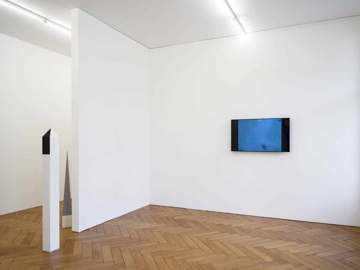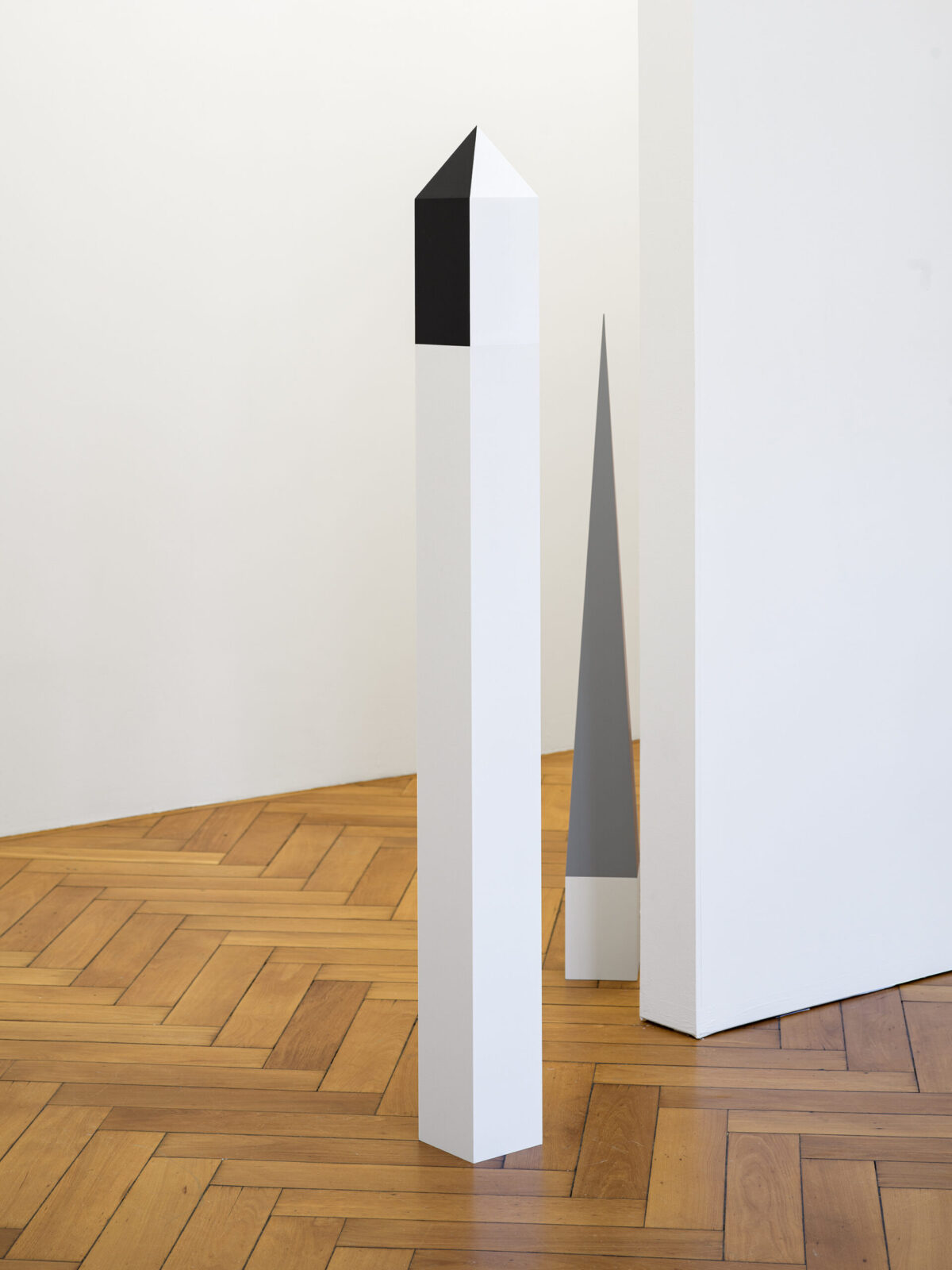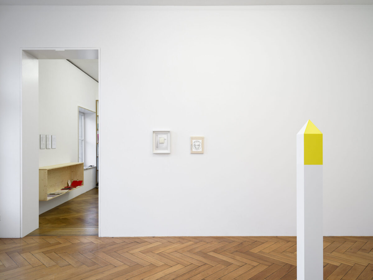 Die Arbeit Silent Monitor 1-4 (2023) ist nach dem gleichnamigen Konzept des Unternehmers, Sozialreformers und Philanthropen Robert Owen (1771–1858) benannt. Owen, der sich gegen die damals übliche, körperliche Züchtigung einsetzte, führte in seiner Fabrik eine Form der Disziplinierung ein, die auf einer für alle sichtbaren Validierung der Arbeiter*innen beruhte. Owens Silent Monitor hatte die Form eines Quaders, der in eine Pyramidenform überging, wobei jede der vier Seiten mit einer anderen Farbe versehen war, die für die Bewertung der Arbeiter*in stand. Die Disziplinarisierung und Validierung der eigenen Arbeit wurde nunmehr verinnerlicht. Die Künstlerin erweitert das Formen- und Farbenrepertoir des Originals und überführt sie ins Skulpturale. Karen Amanda Moser setzt dem Original eine Neudeutung gegenüber und entwirft weitere Kombinationen, die sich auf unterschiedliche Modelle von Arbeit im zeitgenössischen Kapitalismus beziehen. Von der körperlichen Fabrikarbeit, zu Dienstleistung, Emotionsarbeit und Self-management zeichnet sie Verbindungslinien zu einer heutigen Affektökonomie, die in alle Bereiche des Lebens eindringt, als Internalisierung selbstregulierender, ökonomischer Prinzipien.