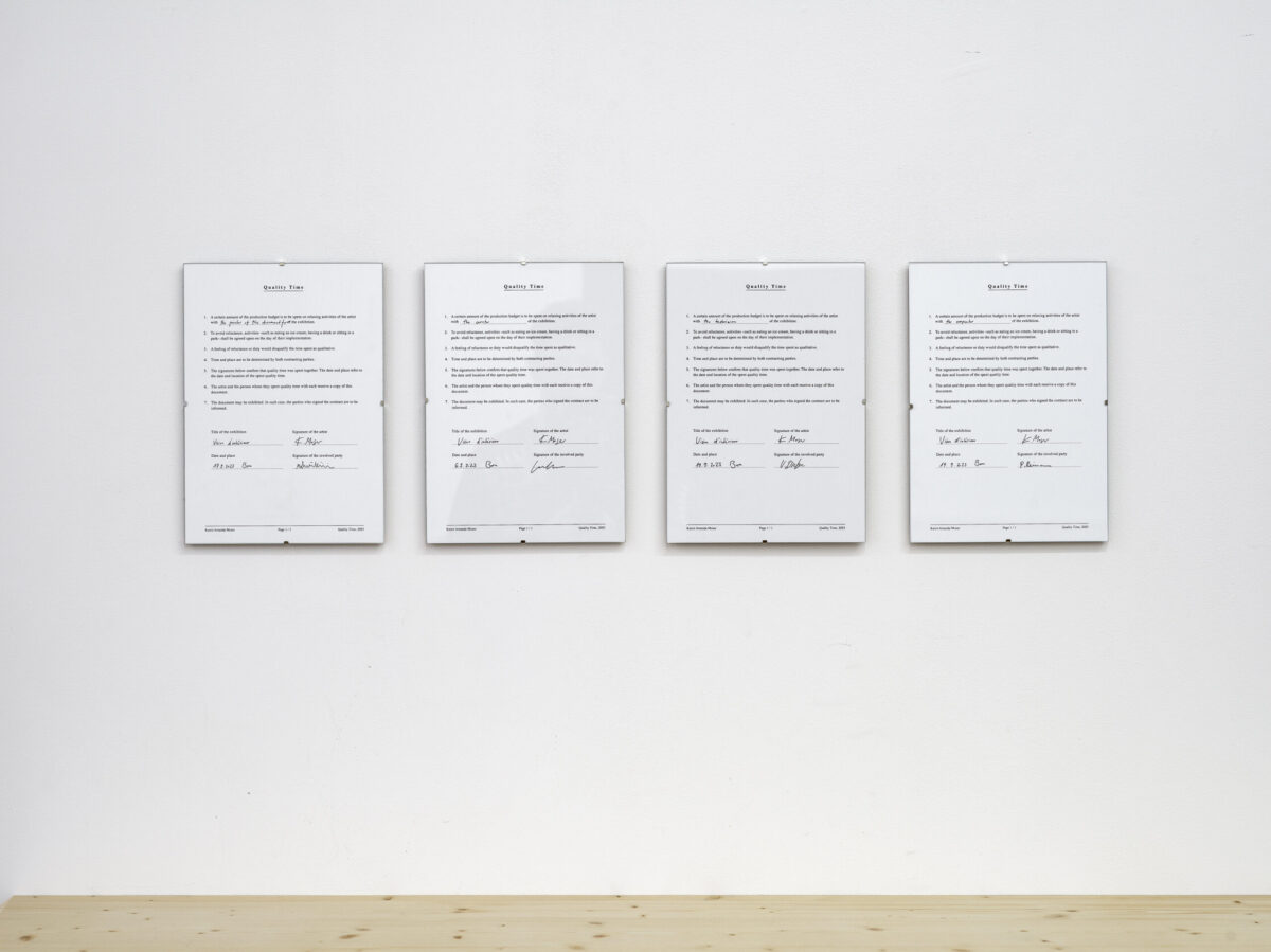 Quality Time (2023) ist eine fortlaufende Arbeit, ein Vertrag, welche die Künstlerin mit den einzelnen Mitarbeitenden der ausstellenden Institution eingeht. Vertraglich wird zwischen Künstlerin und Person der Institution festgehalten, dass ein Teil des Ausstellungsbudgets für gemeinsam «erholsame Aktivitäten» verwendet wird. Die Arbeit kann durch weitere Verträge ergänzt werden.