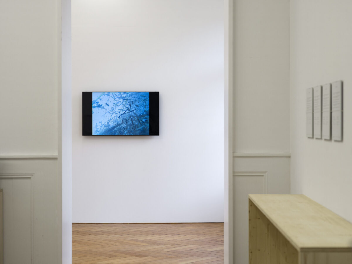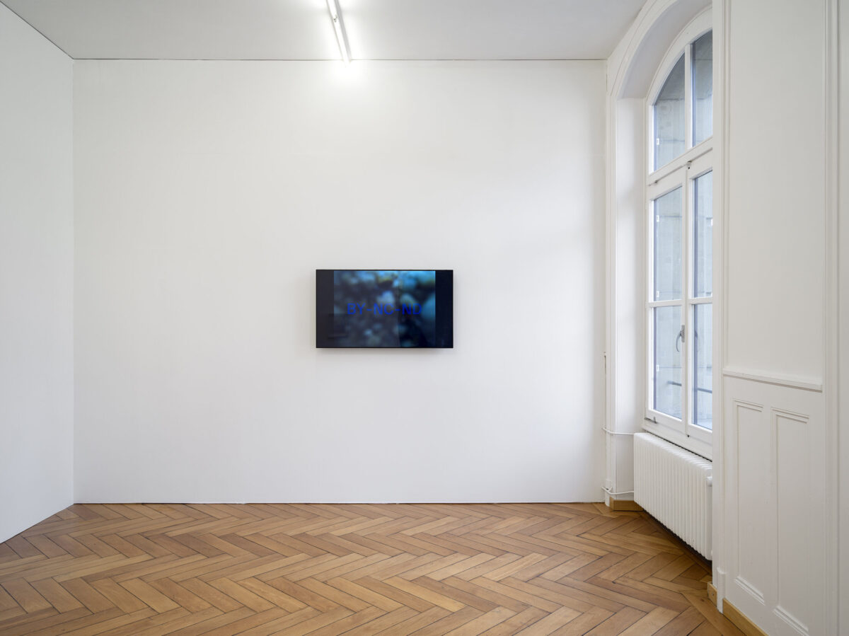 Karen Amanda Moser interessiert sich in Vision d’intérieur für bürokratische und juristische Prozesse, entlang derer sich Urheber*innenschaft, Eigentumsverhältnisse und menschliche Beziehung organisieren. Ohne Titel (Rauschen) (2023) zeigt die Videoaufnahmen einer auf dem Meeresboden verloren gegangenen GoPro-Kamera. Die aufgenommenen Bilder haben keine direkte Autor*innenschaft, da die Kameraführung einzig durch die Bewegung des Meeres geschah. Als Konsequenz macht die Künstlerin das Video auf der Plattform Vimeo öffentlich zugänglich. Immer wieder wird im Video das Wasserzeichen mit dem Schriftzug BY-NC-ND sichtbar – die restriktivste Lizenz unter den Creative Commons, welche die Bedingungen der Weiterverwendung von Werken regulieren.
