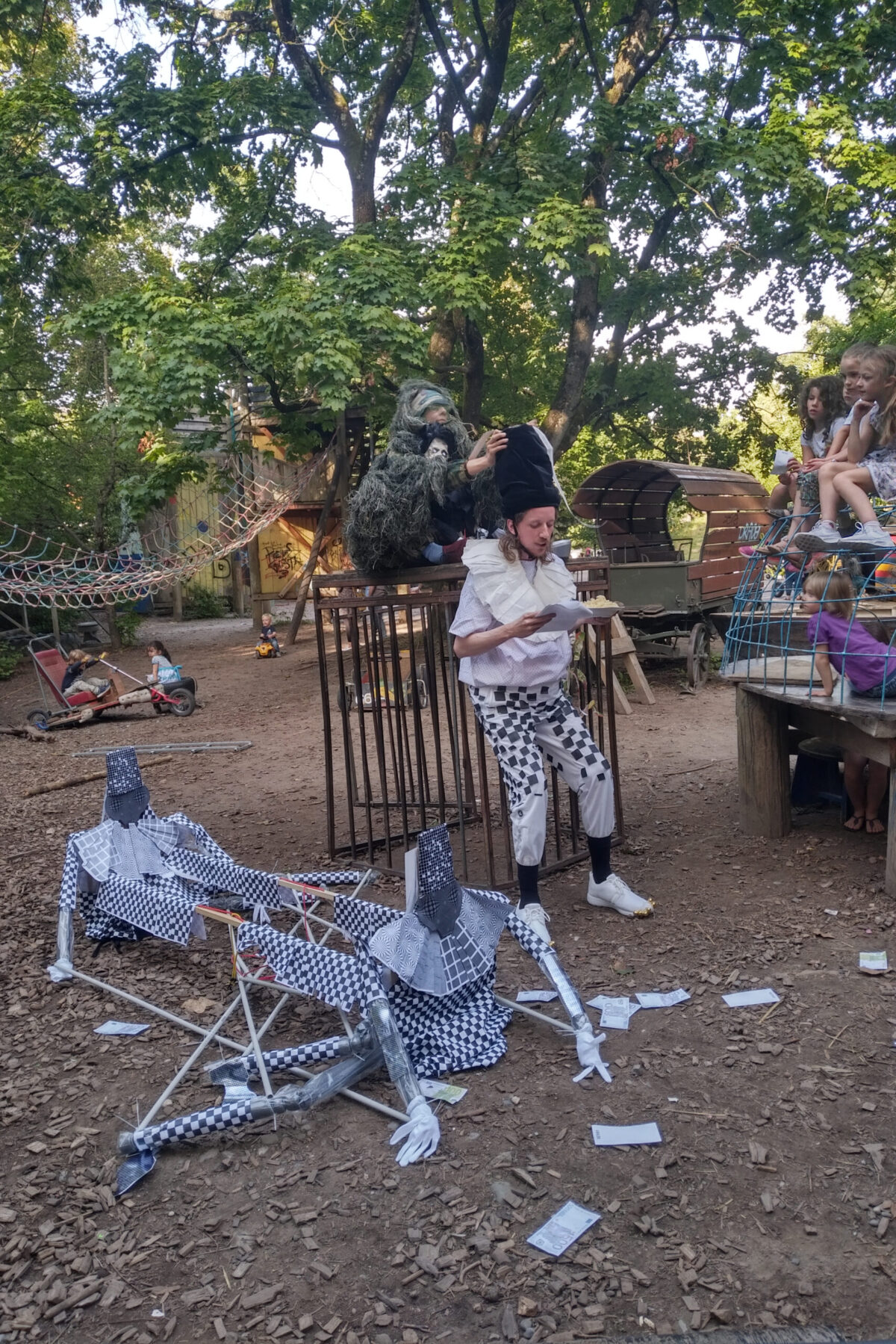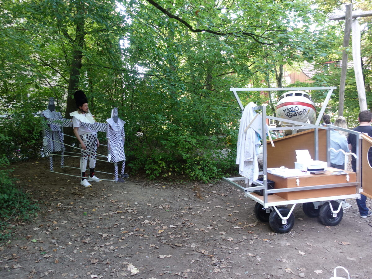 Die komischen Wesen Dickbauchtänzer, Pulecenella und ein Eremit im Angestelltenverhältnis treffen zufällig zusammen. Was haben sie miteinander zu schaffen? Die Meinungen gehen schnell auseinander: Dickbauchtänzer reisst nur derbe Spässe, Pulecenella ist hungrig und der Eremit will doch nur seine Ruhe haben – gibt dann aber doch ein paar Gedichte zum besten. Eine Komödie mit acht Beinen!