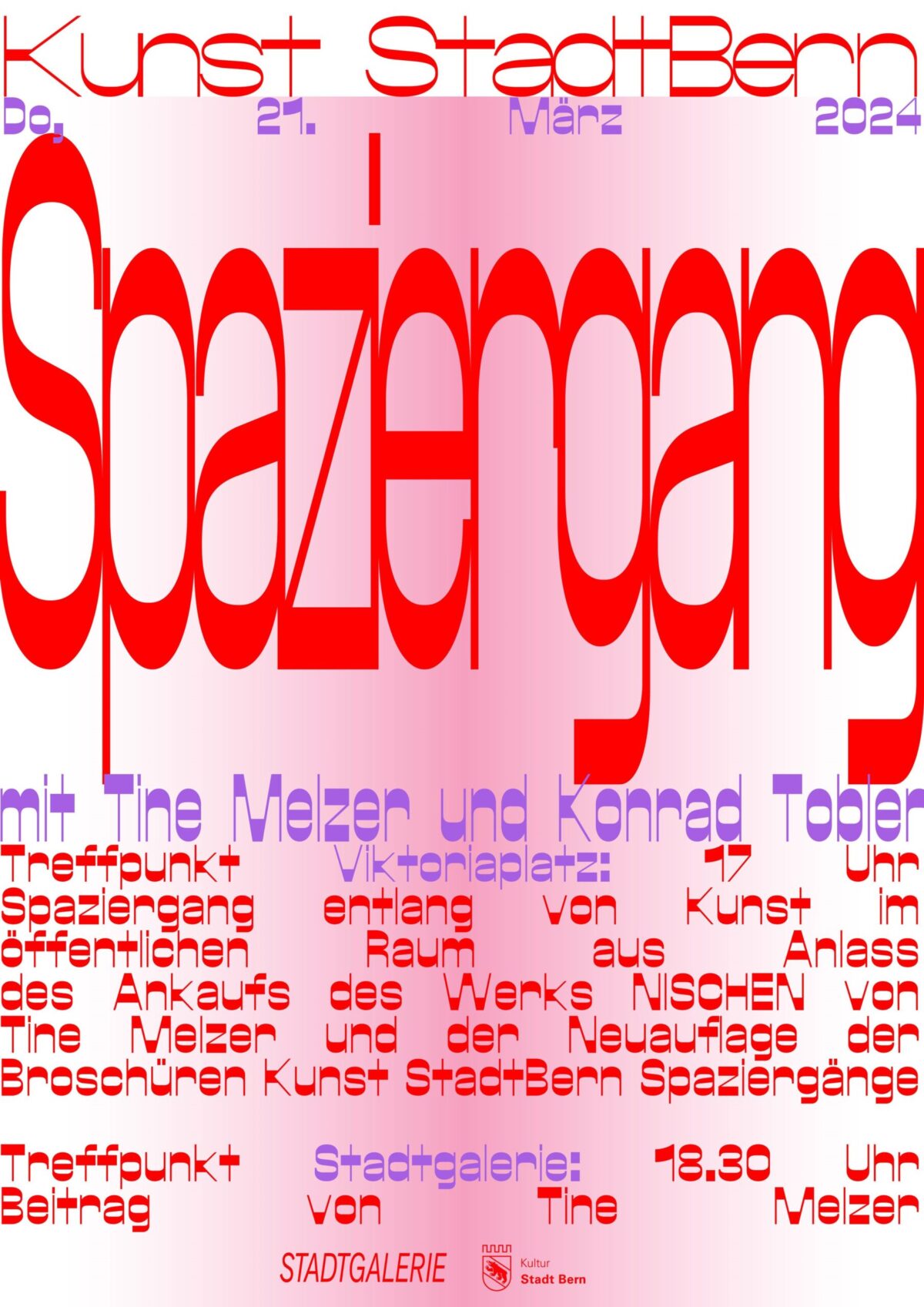 Die Veranstaltung findet anlässlich des Ankaufs des Werks NISCHEN durch die Stadt Bern und der Neuauflage der Broschüren Kunst StadtBern Spaziergänge statt. Der Spaziergang findet nur bei trockenem Wetter statt. Ab 20. März wird auf der Website der Stadtgalerie kommuniziert, ob der Spaziergang stattfindet. Die Werkeinführung in der Stadtgalerie findet bei jedem Wetter statt.