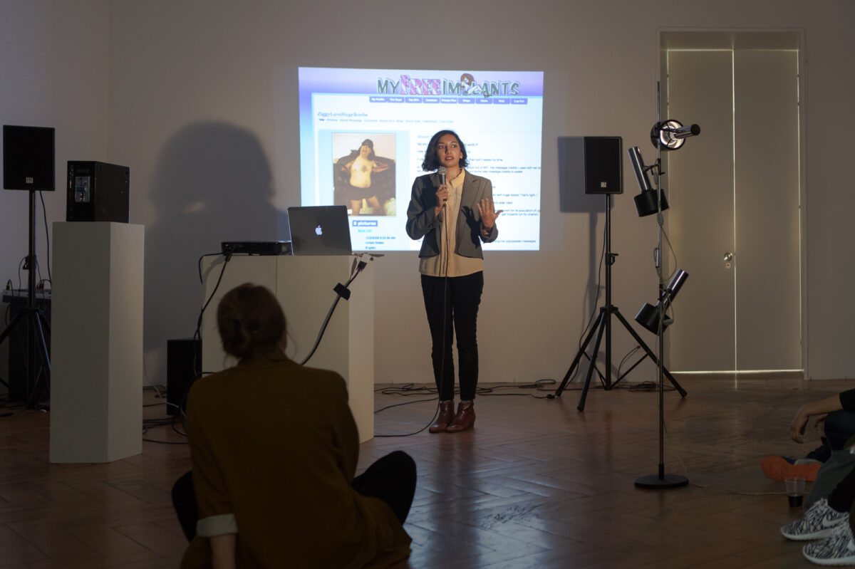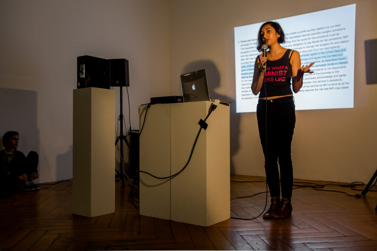 Für Sunny & Benny Together Forever (2008–2009) kreierte SUNITA PRASAD zwei Accounts auf der Crowdfunding-Homepage myfreeimplants.com. Frauen schreiben sich dort ein, um ihre Brustvergrösserung oder andere Schönheitsoperationen zu finanzieren. Im Gegenzug geben sie erotisches Bild- und Videomaterial für ihre Spender preis. Prasad tritt einmal als Sunny und einmal als Benny auf, um in einer Art Sozialstudie beide Seiten dieser speziellen Online-Gemeinschaft nachvollziehen zu können. Es ist ein Experiment, das sich intensiv mit den Geschlechterrollen und dem Verhältnis von Bezahlung und Arbeit in Form der Freigabe von Bildern des eigenen Körpers auseinandersetzt. Prasad regt damit die Diskussion über die Art und Grenzen der Präsentation des Frauenkörpers in digitalen Medien an, die im Zeitalter der Zensur weiblicher Brustwarzen auf Instagram aktueller nicht sein könnte. In der Ausstellung sind zwei Versionen der Arbeit Sunny & Benny Together Forever zu sehen. Zum einen ist das Experiment als interaktives Werk vertreten, zum anderen wird die Künstlerin am 13. Juli ihre Arbeit in einer Lecture-Performance vortragen.
